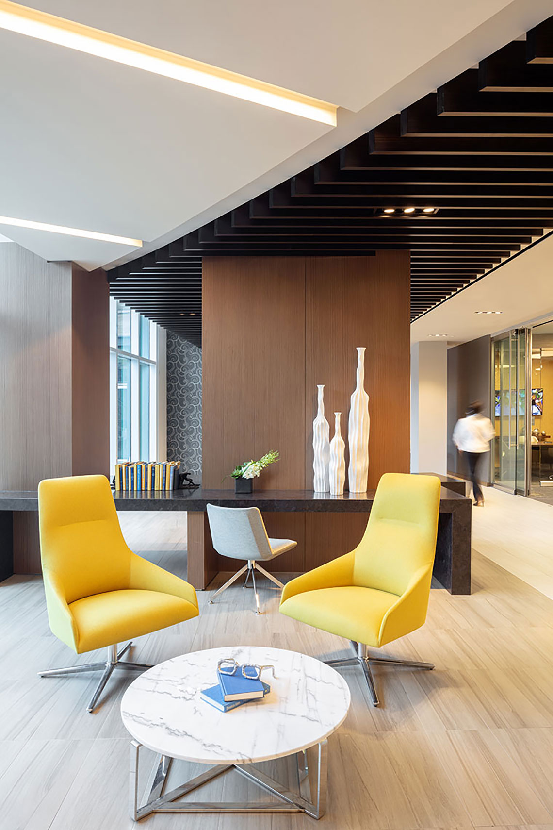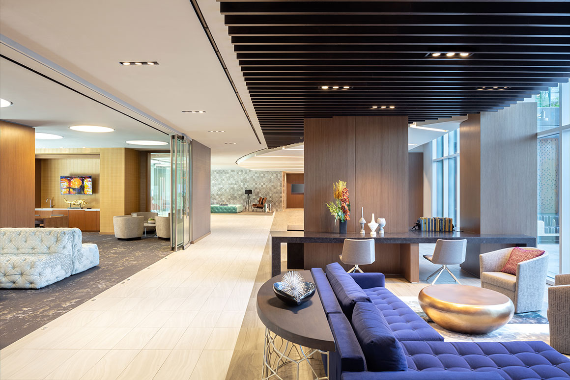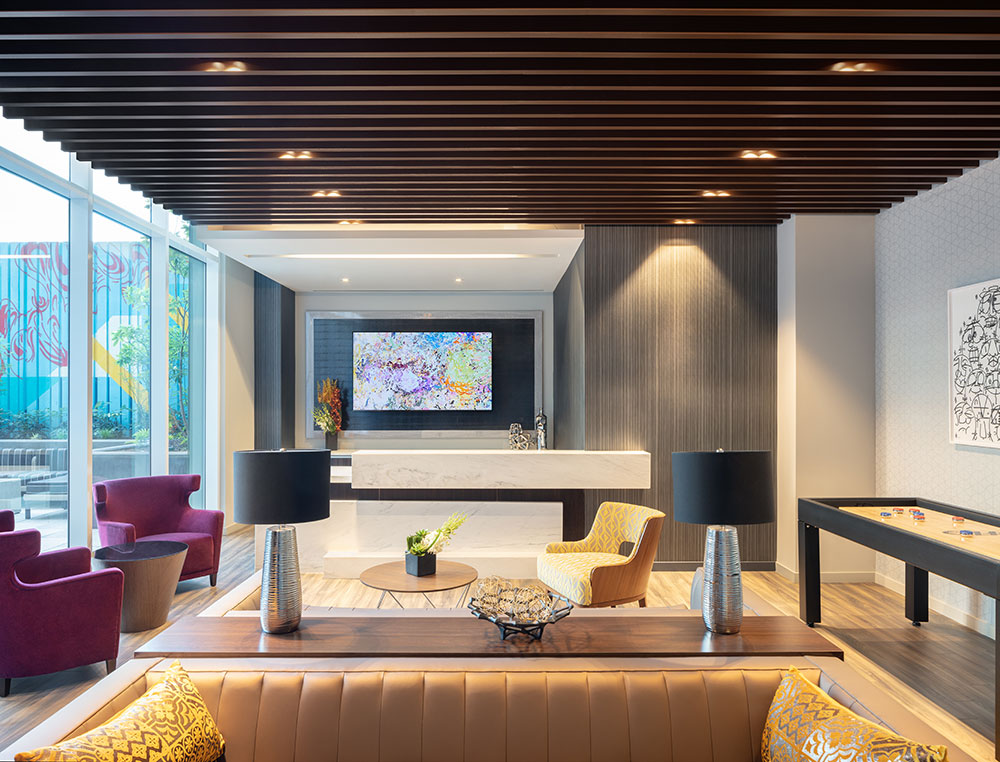 Upon entering the property residents are welcomed with the subtle elegance of distinguished living. The lobby exhibits an open plan with seating areas and a concierge desk leading guests to the visual and physical connectivity of the courtyard, private bar and lounge, and fitness center also featuring a yoga area. Other amenities include a large rooftop terrace with architectural embellishment offering residents views of prominent DC landmarks on the National Mall. The finishes display the quiet luxury sought out by area residents that differentiate it from neighboring properties.