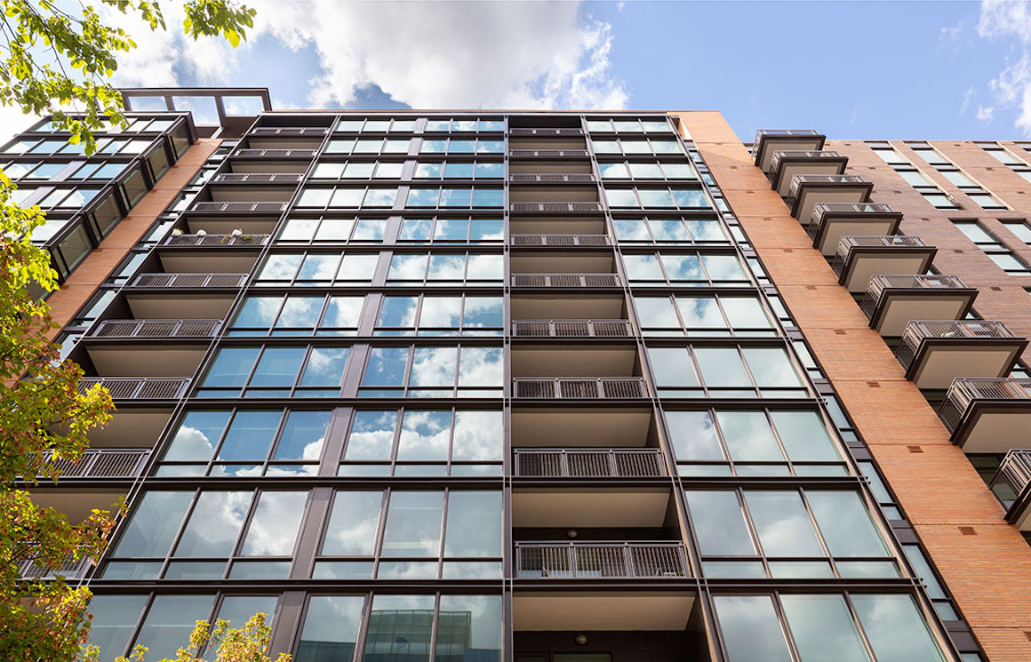 Design for the building was influenced by the industrial look of the train overpasses to the east. The ground floor stonework pays homage to the existing retaining wall adjacent to the property designed by architect Daniel Burnham in 1907. Located on the south and east side of the property, the wall supports the elevated train tracks that start at Union Station and head north. The exterior façade consists of two different colors of brick for a rich blended tactile feel that breaks down the massing. Large bay windows and balconies were incorporated to provide residents with ample sunlight and remarkable views of the surrounding urban area.