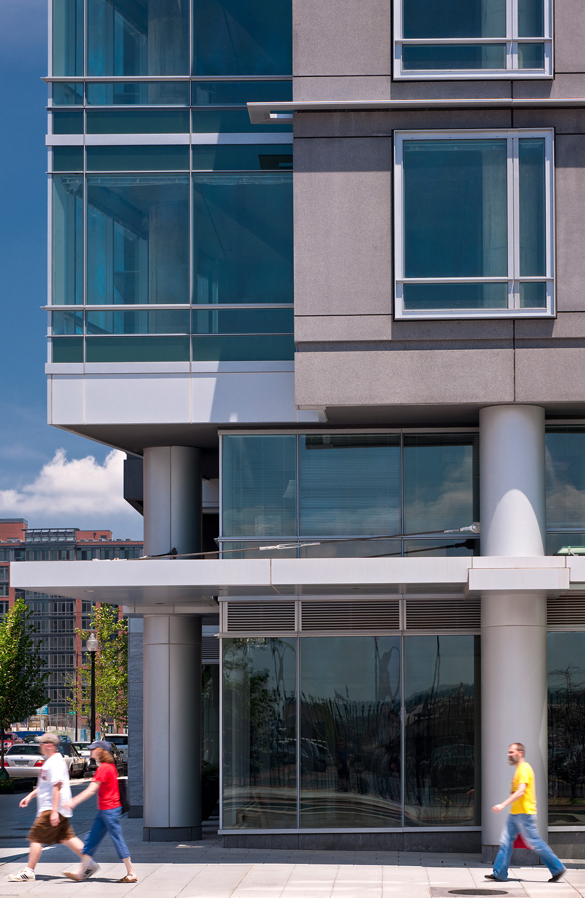 100 M Street features sophisticated, custom designed curtain wall facades along its two prominent street elevations, and punched opening precast at its alley and courtyard exposures. The First Street façade is emphasized by a bold stone clad vertical fin as recognition of the street’s role as a major gateway to the baseball stadium. The building achieves a sense of modern transparency by combining extensive glazing with dematerialized gray precast panels, expressed as floating planes which appear to hover proud of the building’s primary mass.