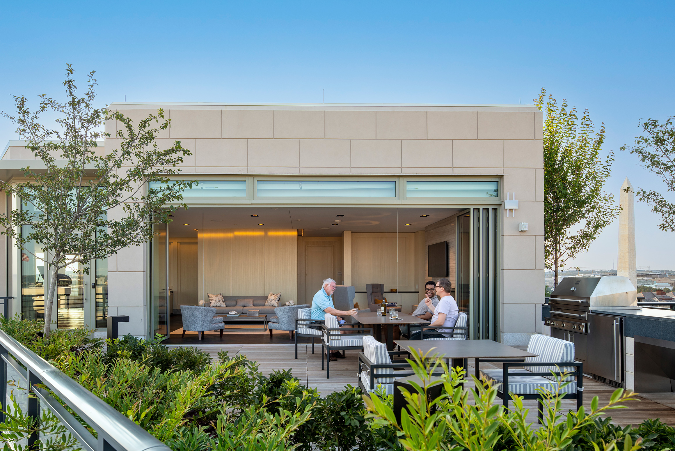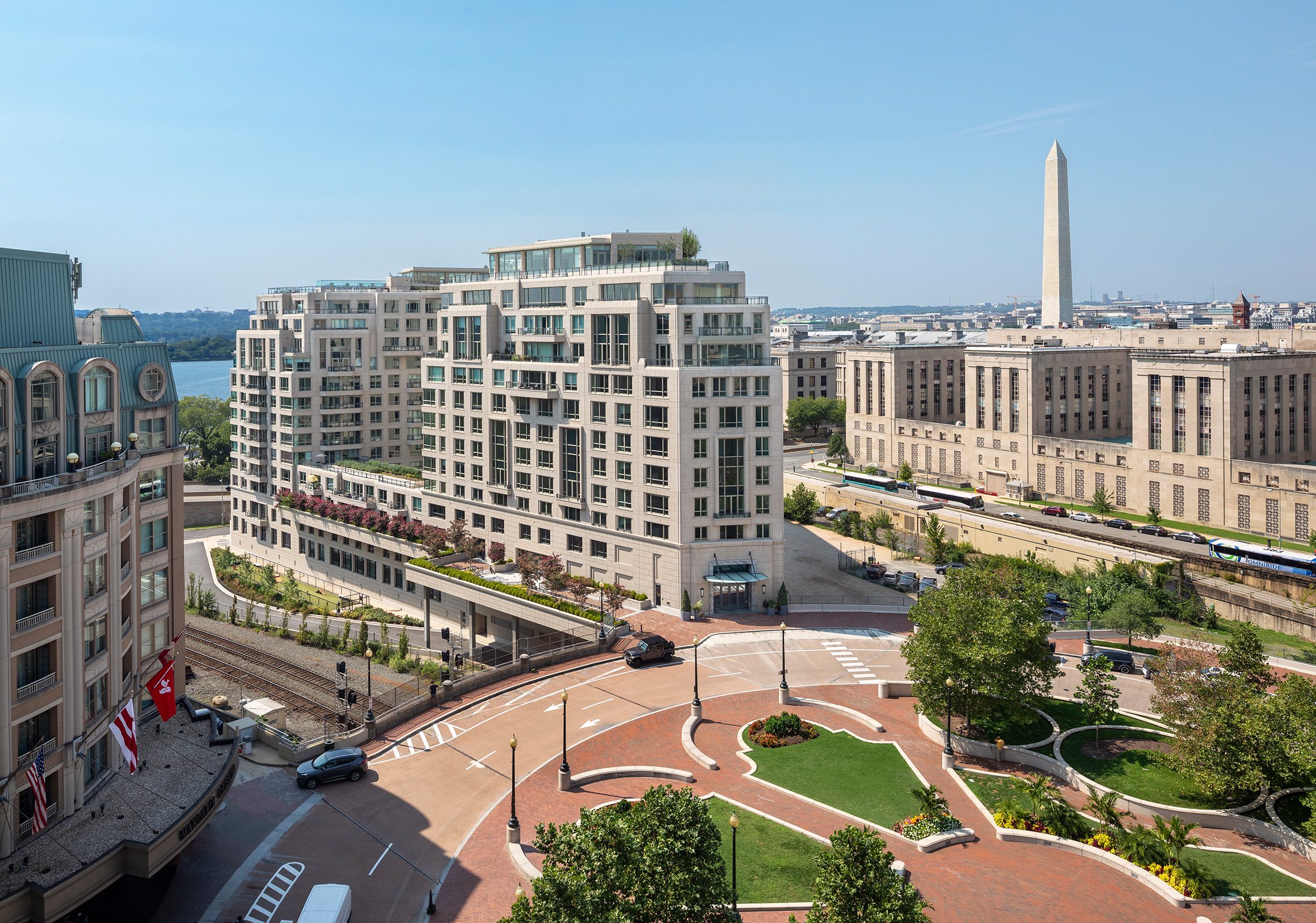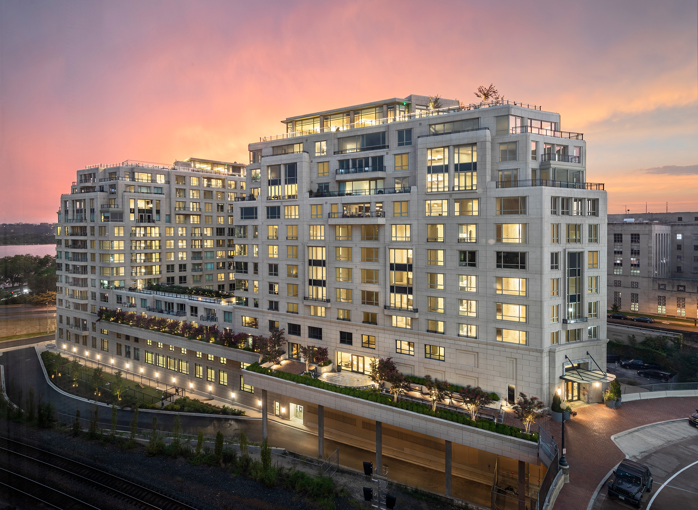 Luxury amenities capitalize on sightlines to two Washington symbols—the Jefferson Memorial and the US Capitol—as well as stunning city and river views. Residents enjoy a programmed rooftop with pool, walking paths, grilling areas, private club rooms, and a fitness center. Environmentally sustainable features are integrated throughout and include a planted roof deck, sky courtyard, vertical greenwall, and private terraces.