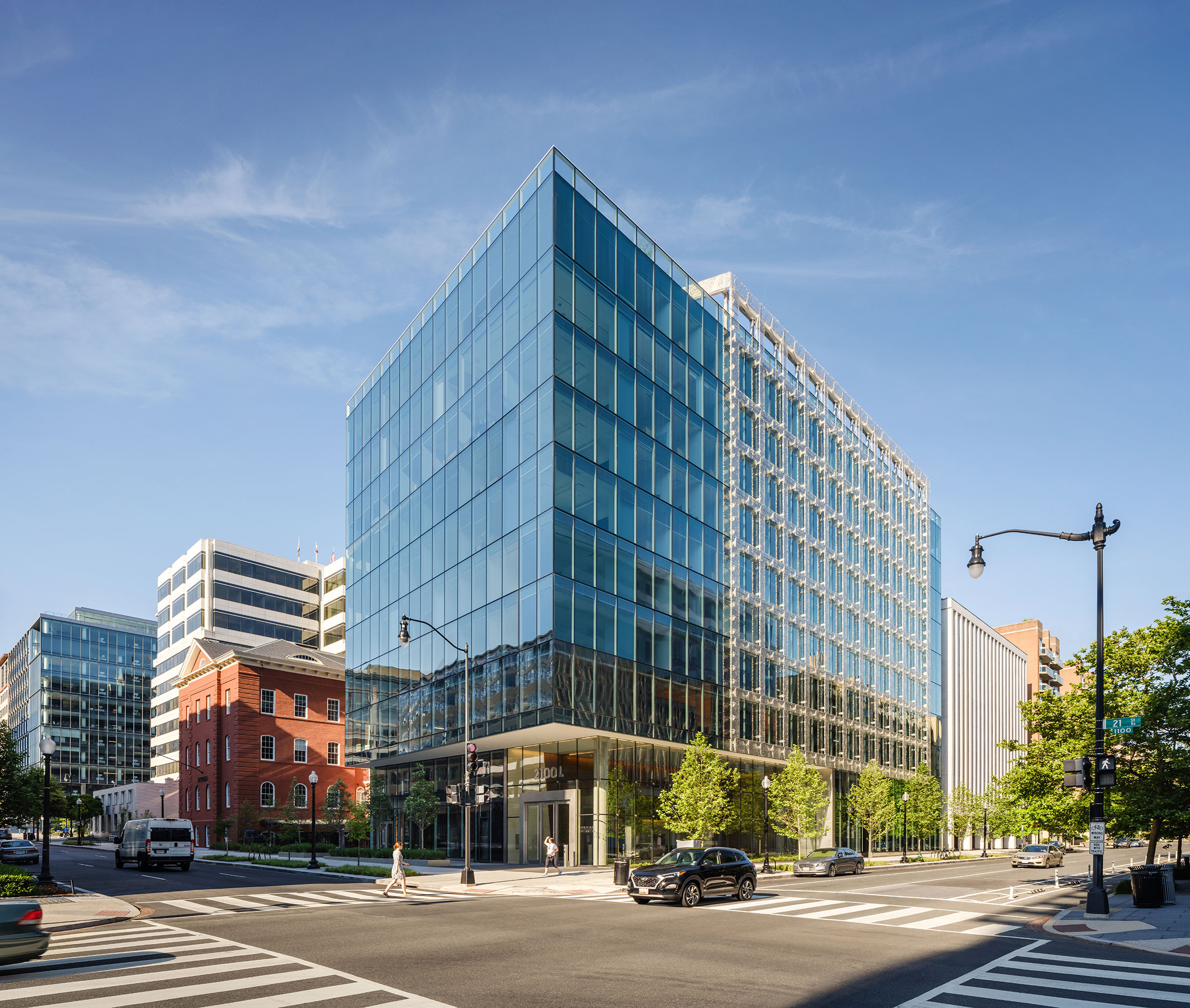 DC’s historic preservation proponents wanted more glass for the project’s facade. The idea was to contextually align with the U.S. Green Building Councils’ glass facade headquarters across the street at 2101 L St NW, also designed by WDG. In doing so, WDG incorporated a technique whereas the diagonal veil intersects the project and avoids the appearance of a single glass plane.