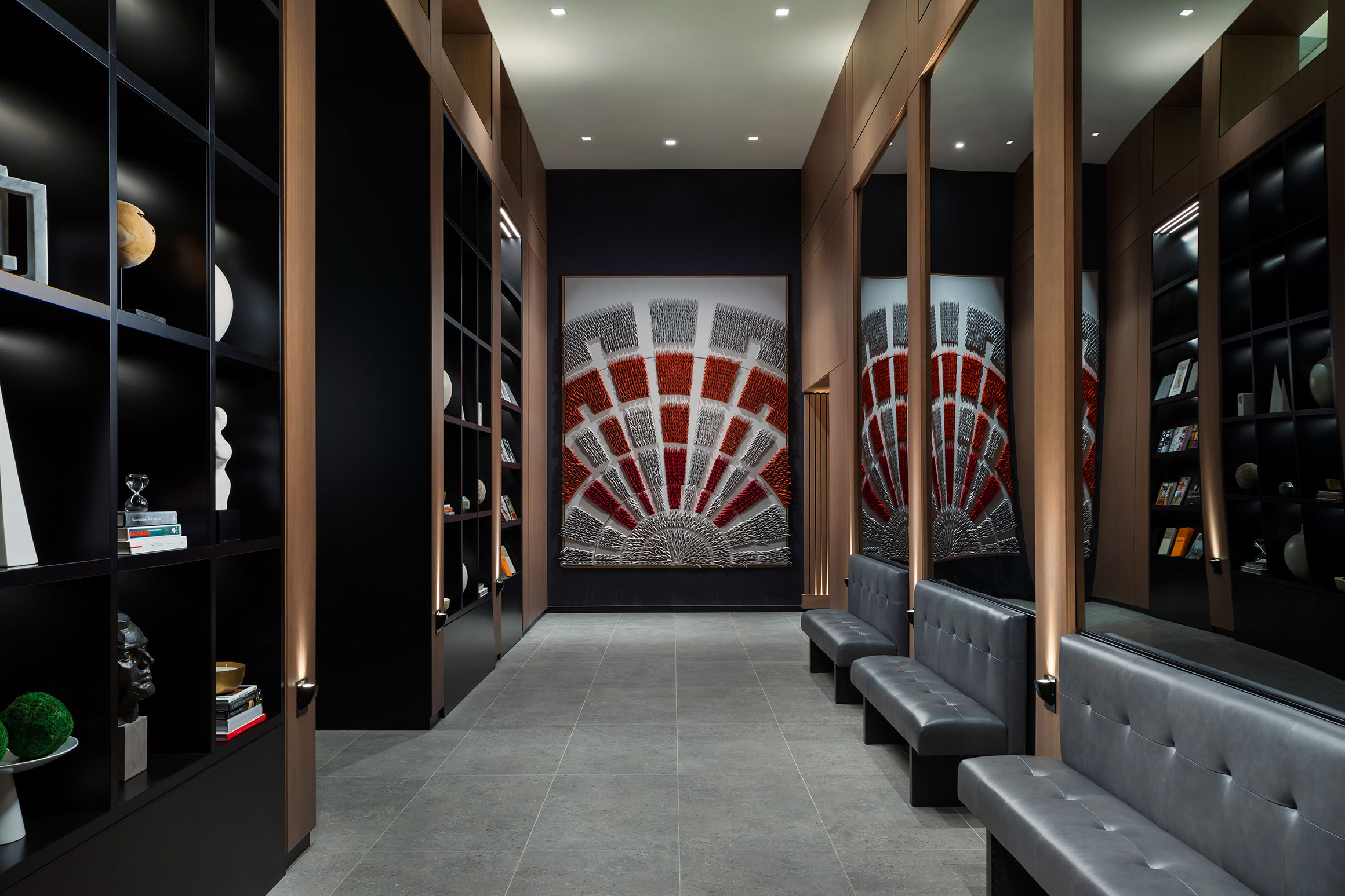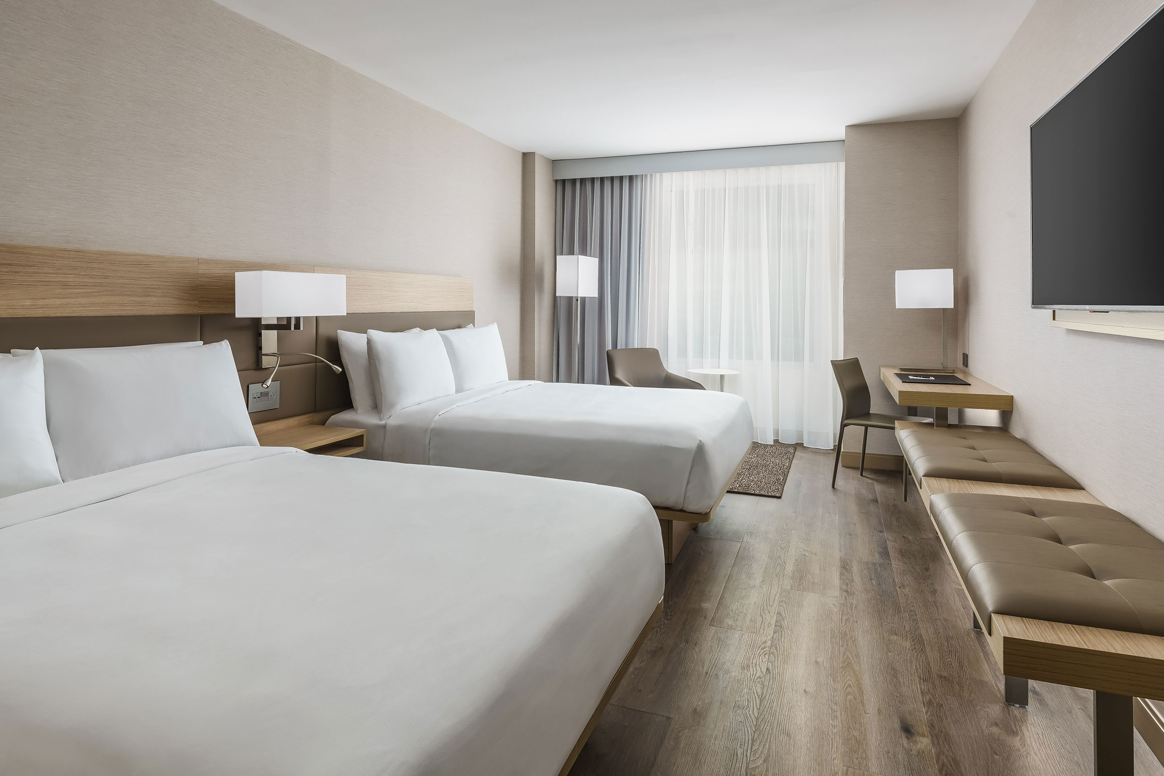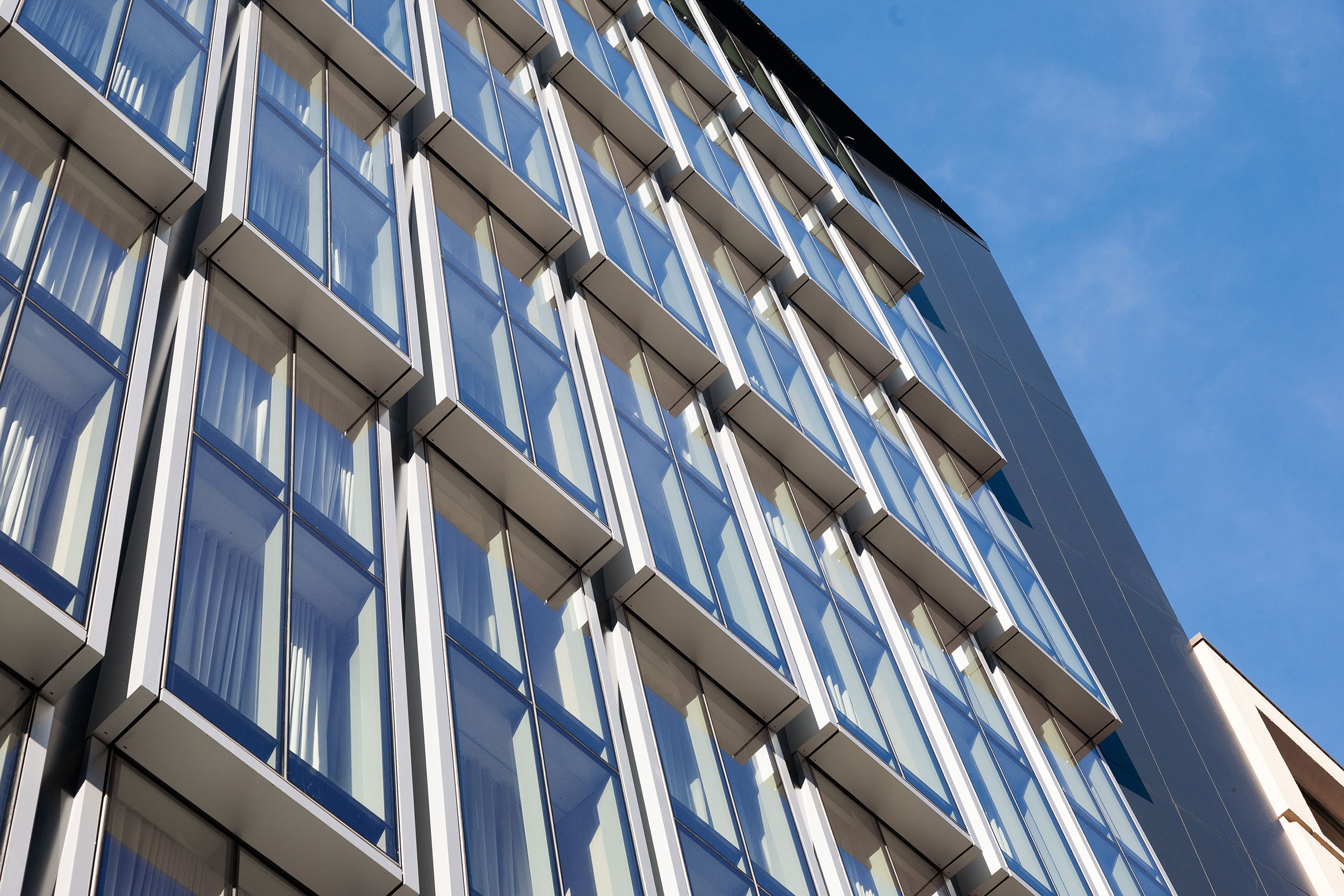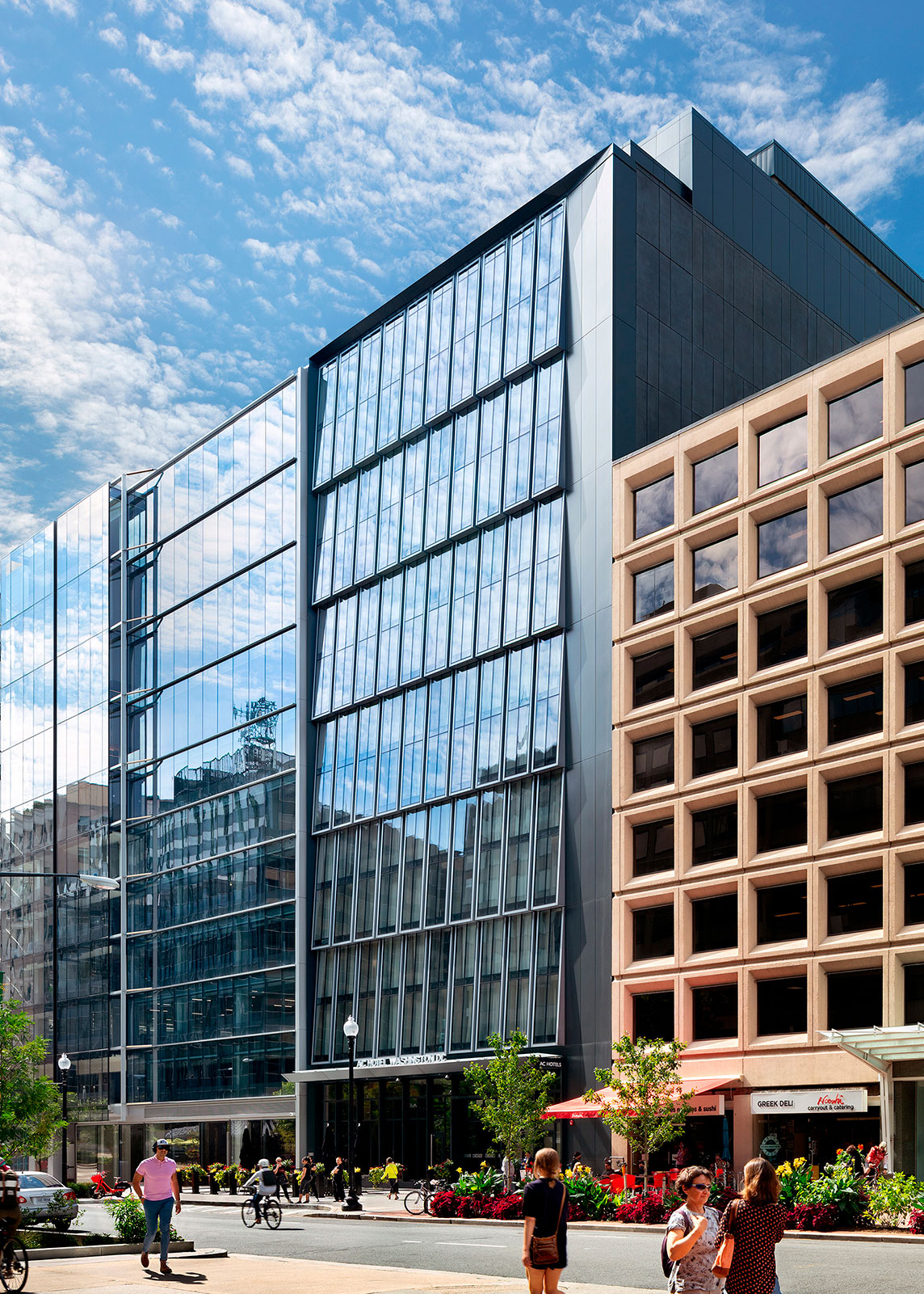 The proposed AC Hotel fills a narrow, rectangular-shaped site located at 1112 19th Street, NW between L St. NW and M St. NW, just south of Dupont Circle in Washington, DC. Sitting adjacent to two 8-story precast-clad office buildings, the new hotel’s main façade along 19th Street features a delicate, inclined two-story custom unitized curtain wall system whose panels’ unique arrangement contributes to create a subtle texture to the surrounding urban fabric.