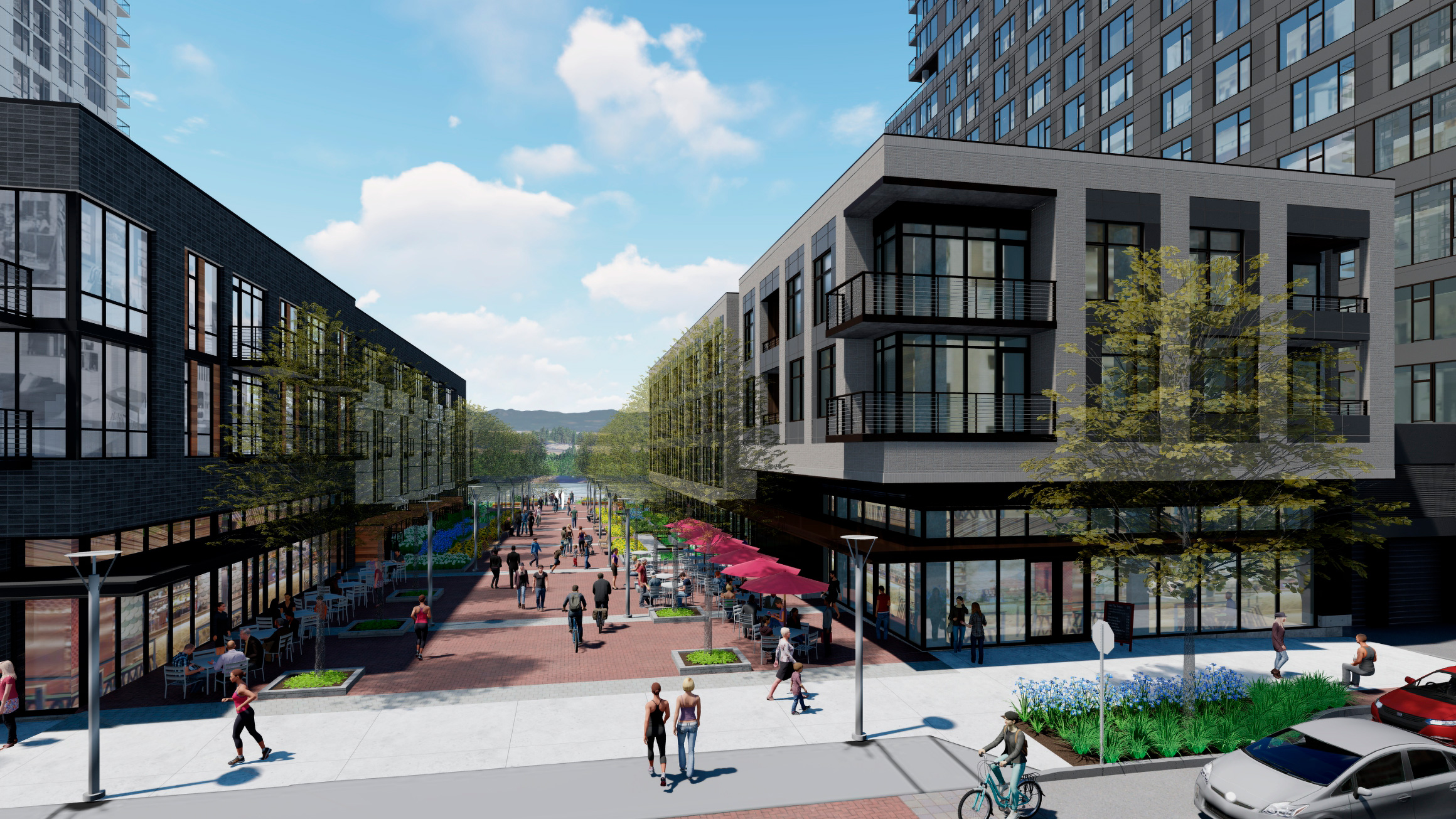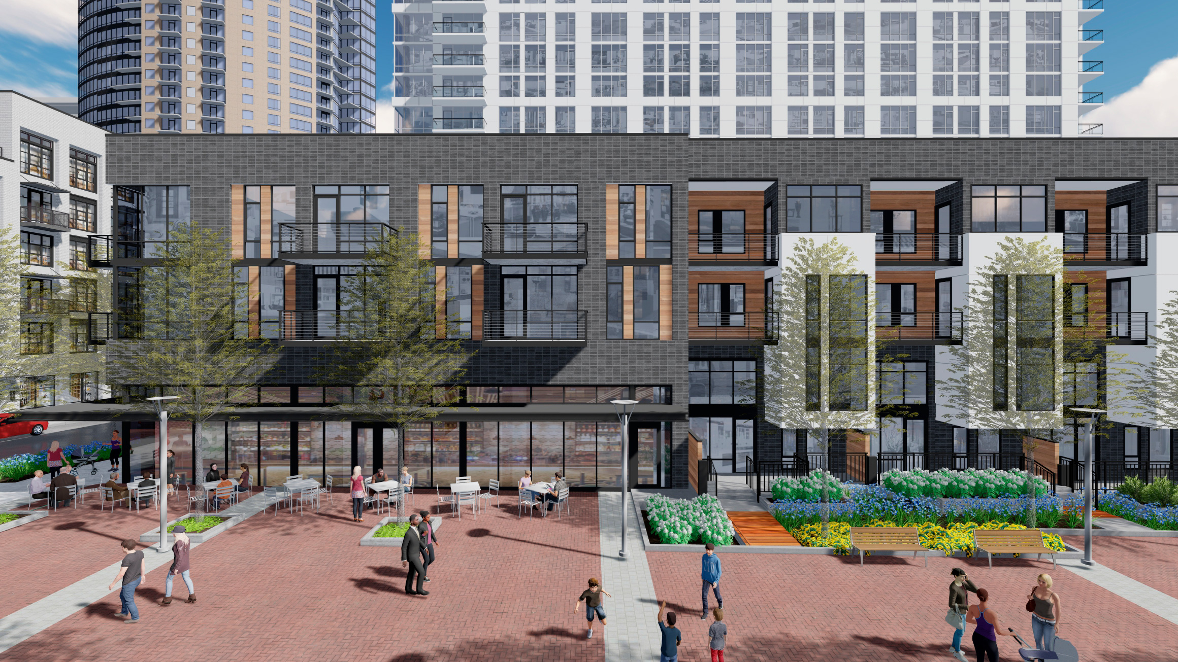 Two 23-story high-rise towers. Block 41 includes 340 residential units, 333 parking spaces, and 3,800 sf of shell commercial space. Block 44 includes 362 residential units, 278 parking spaces, 2,500 sf of shell commercial space, and 2,800 sf of ground floor maker spaces. The base of each tower includes 4 levels of wrapped above-grade parking. Gross building area will total 494,000 sf for each, but the project also includes 13,000 sf (Block 41) and 11,000 sf (Block 44) of above-grade, structured outdoor amenity area.