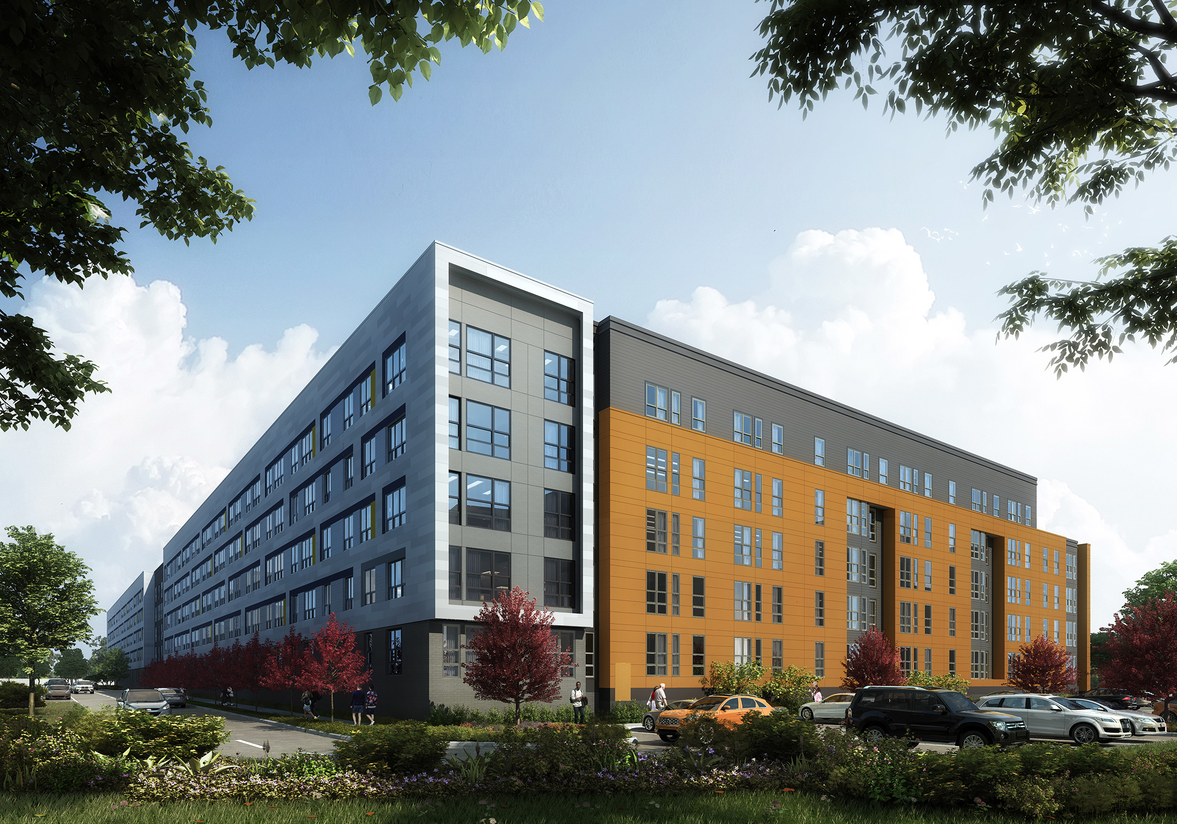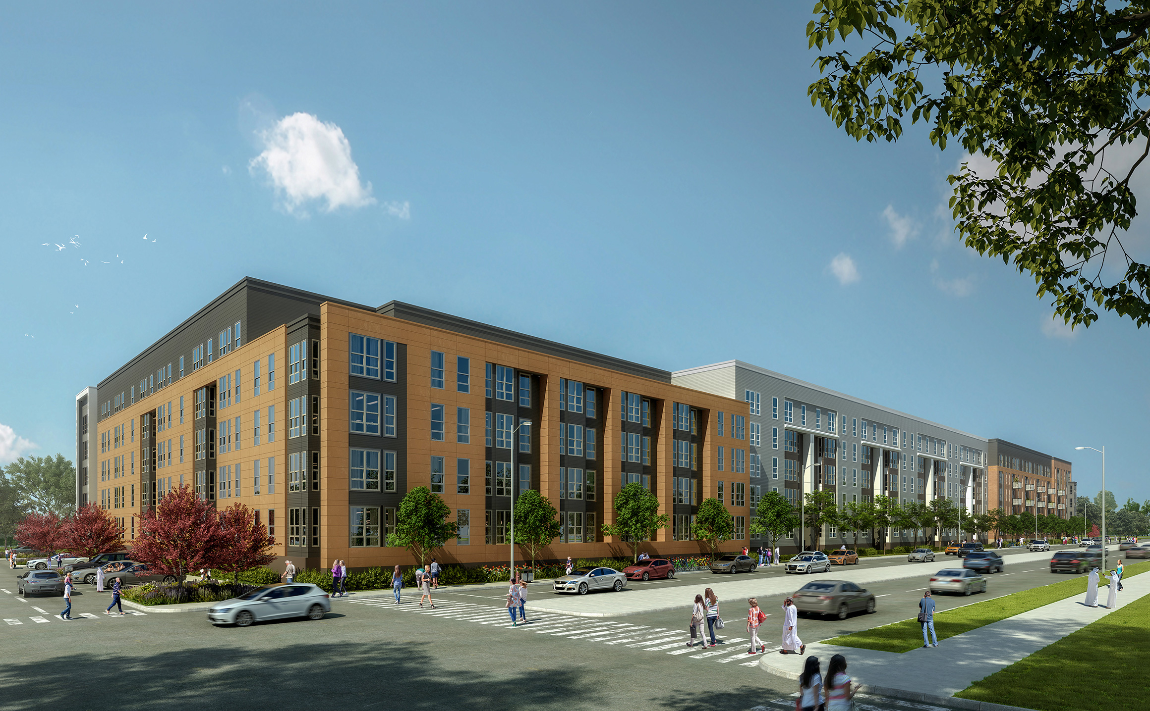 Both apartment buildings also include private landscaped courtyards, two-story community rooms, two-story fitness rooms, and rooftop terraces overlooking three private courtyards and a Village Green adjacent to the Metro station. The Intermodal Village Green features 240 linear feet of retail storefront, wide sidewalks, open plazas, landscaping, and a pavilion/bridge spanning the Brook Parcel stream.