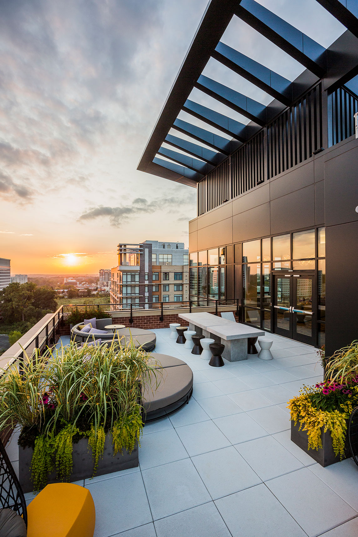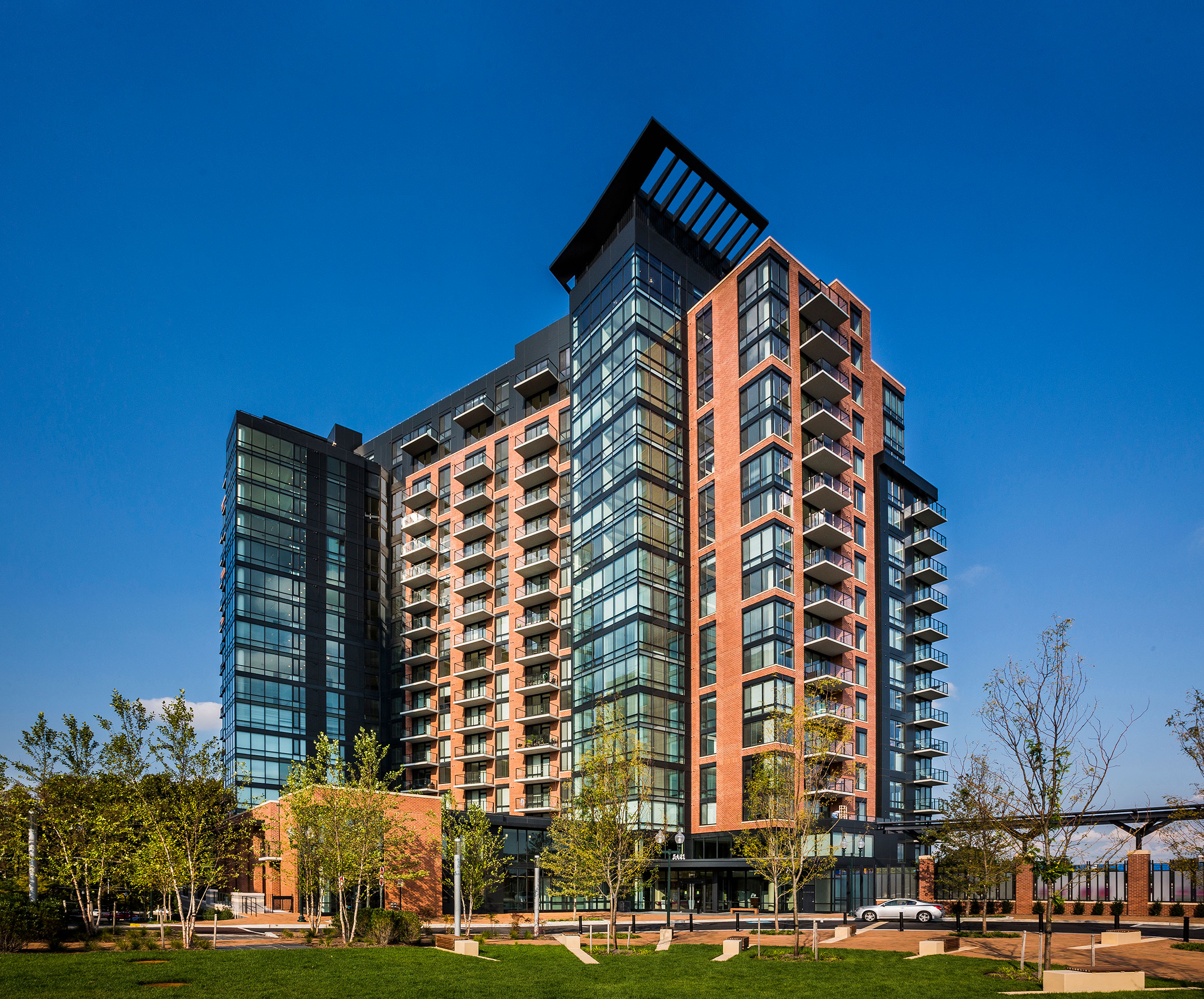 18-story, 341-unit apartment tower as part of North Bethesda Center—a mixed-use town center at White Flint Metro in North Bethesda, MD. Amenities include pool, garden, fitness center, business center, and a rooftop clubroom.