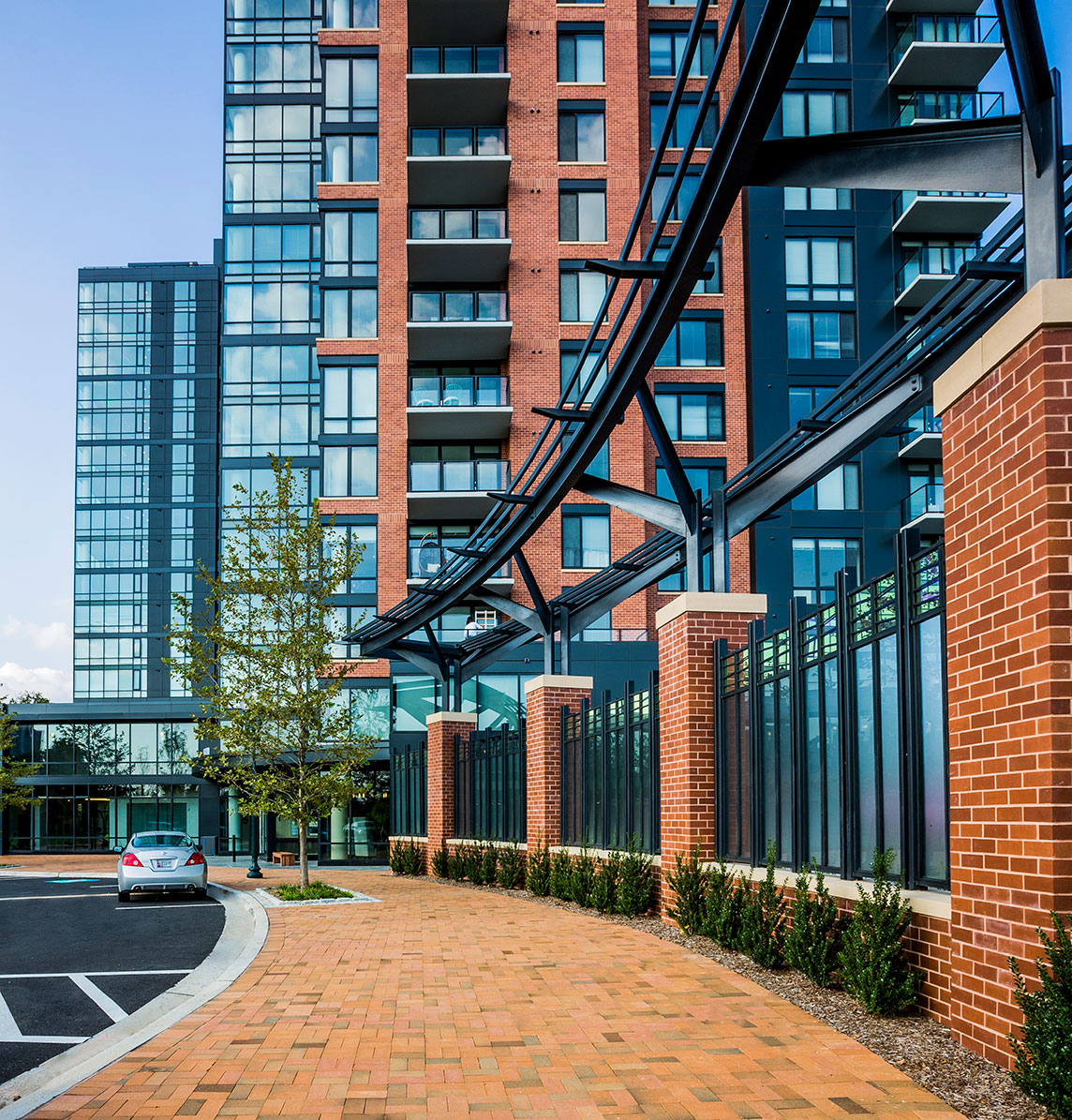 A glass storefront system, held by lustrous metal panels, articulates the building’s base and breaks down the scale of the parcel. Increased transparency creates visual interest for pedestrians walking about the larger mixed-use development. The metal panels become an armature for tri-colored brick above. Building mass is organized in to three distinct metal and glass towers, connected by brick masonry planes. The main corner tower provides a strong visual anchor and marks the main entrance while setting up a new departure point for the potential future phase opposite a central courtyard. Materials find cohesion in contrast; opposing textures and colors work in tandem to link the towers. A curtain wall system with unique glass spandrels further articulates verticality and defines the implied curves between each corner. Single-story balconies interface with multi-story openings to create visual scale and vertical rhythm; achieving this balance provides balconies to 70% of the building’s units.