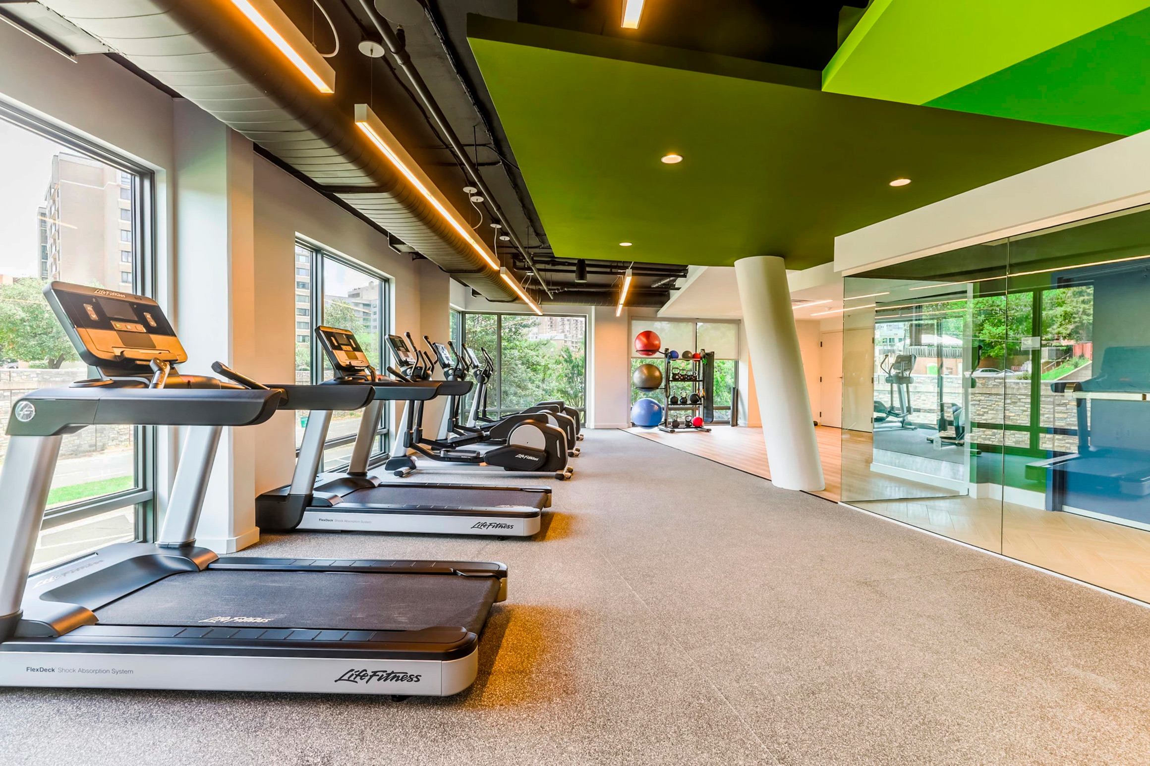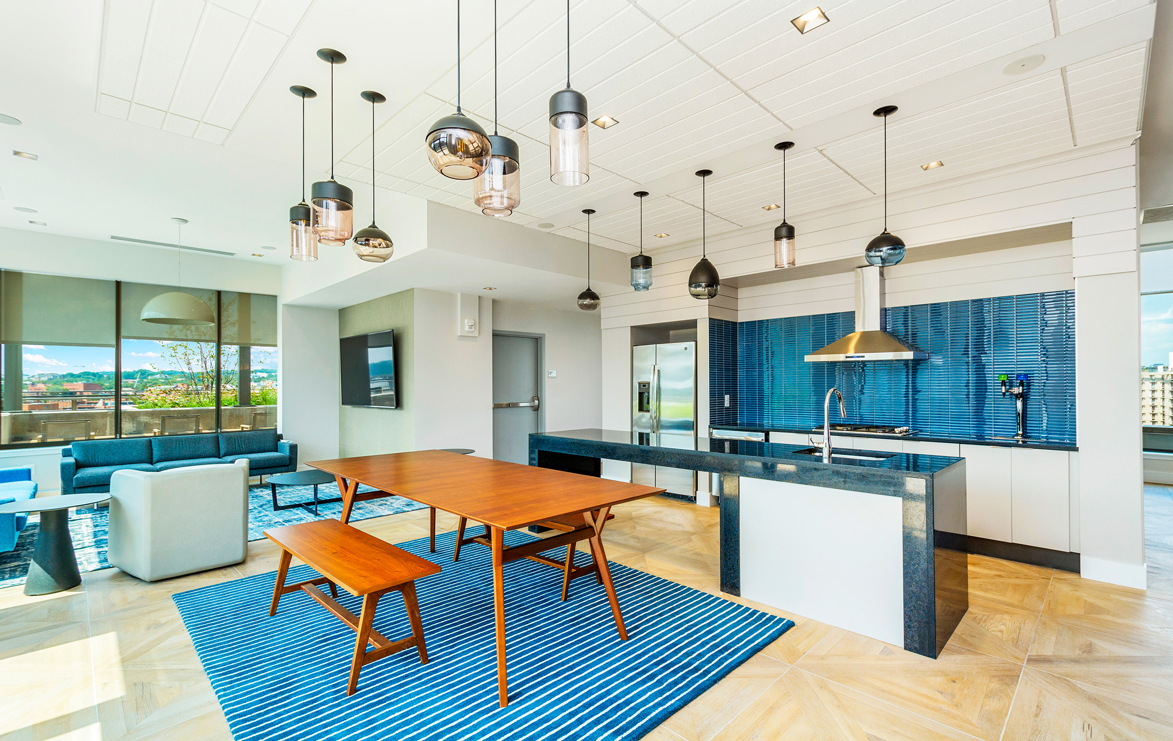 A two-story lobby with grand stair leads to a second level fitness center, while a rooftop terrace features a new swimming pool, large club room with full kitchen, an indoor/outdoor bar, and an expansive green roof, offering spectacular views of the Potomac River, Georgetown, and the City’s iconic National Mall and Monuments.
