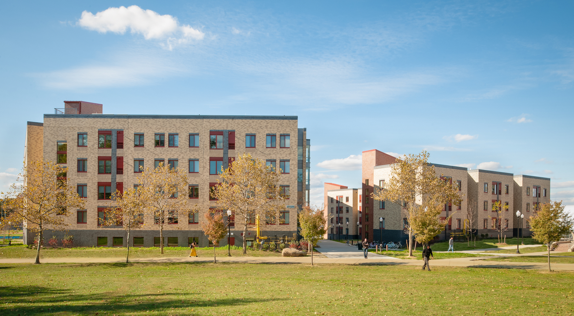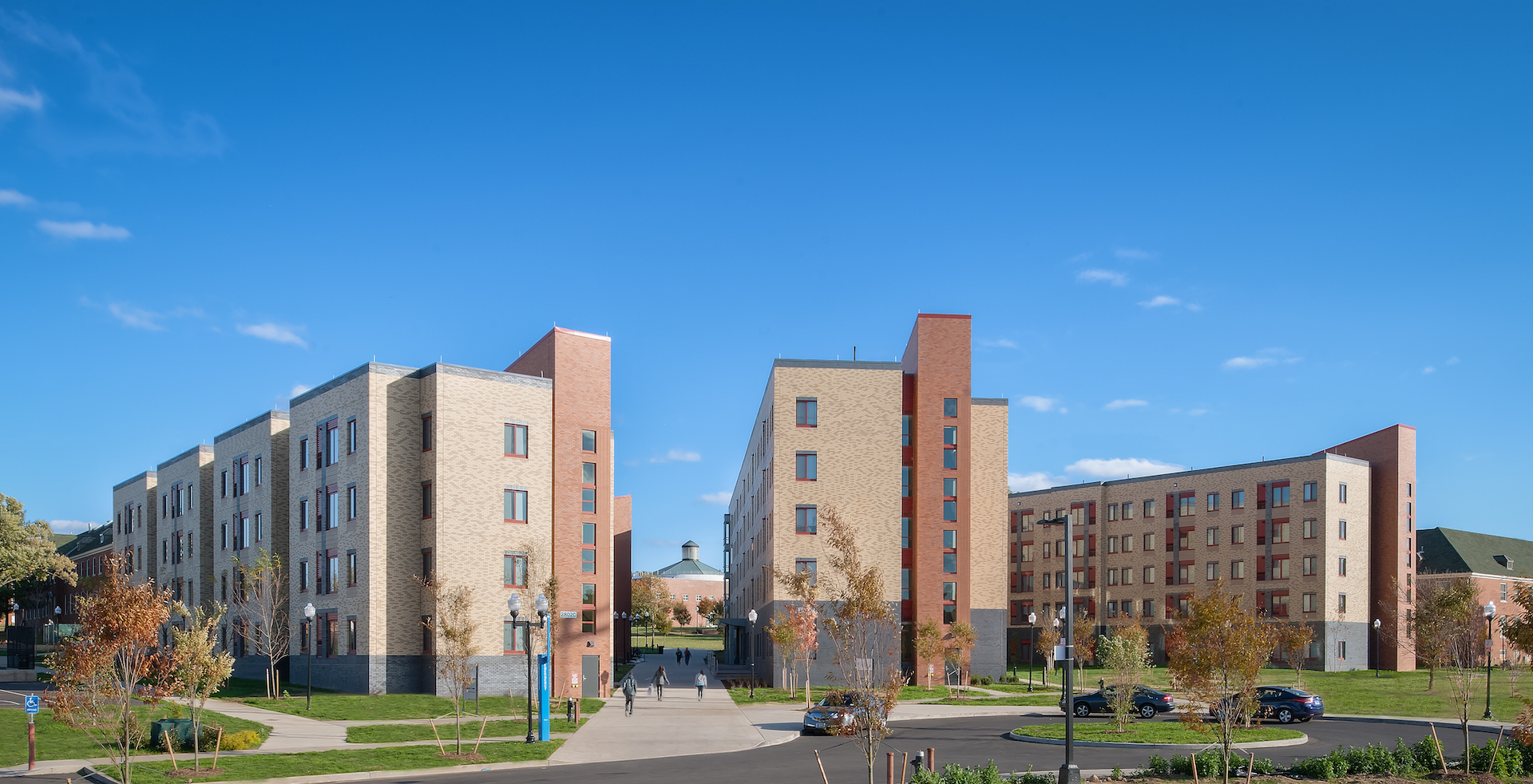 The project consists of two buildings, one four stories and one five. The layout of the buildings, with a northwest axis running through the North Quad, forms a triangular outdoor courtyard with centralized amenities and gathering areas. The design creates a pedestrian activity corridor that intersects the existing pedestrian corridor from the northwest and is aligned with the cupola of the centrally located Campus Center. The new pedestrian thoroughfare ties the various elements of the North Quad together, with the new buildings oriented densely around the route to create a sense of community.