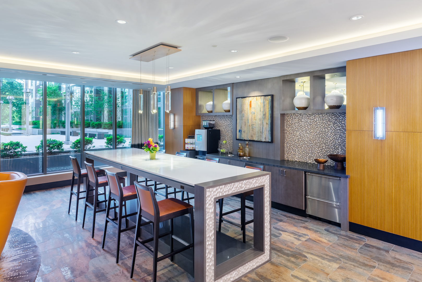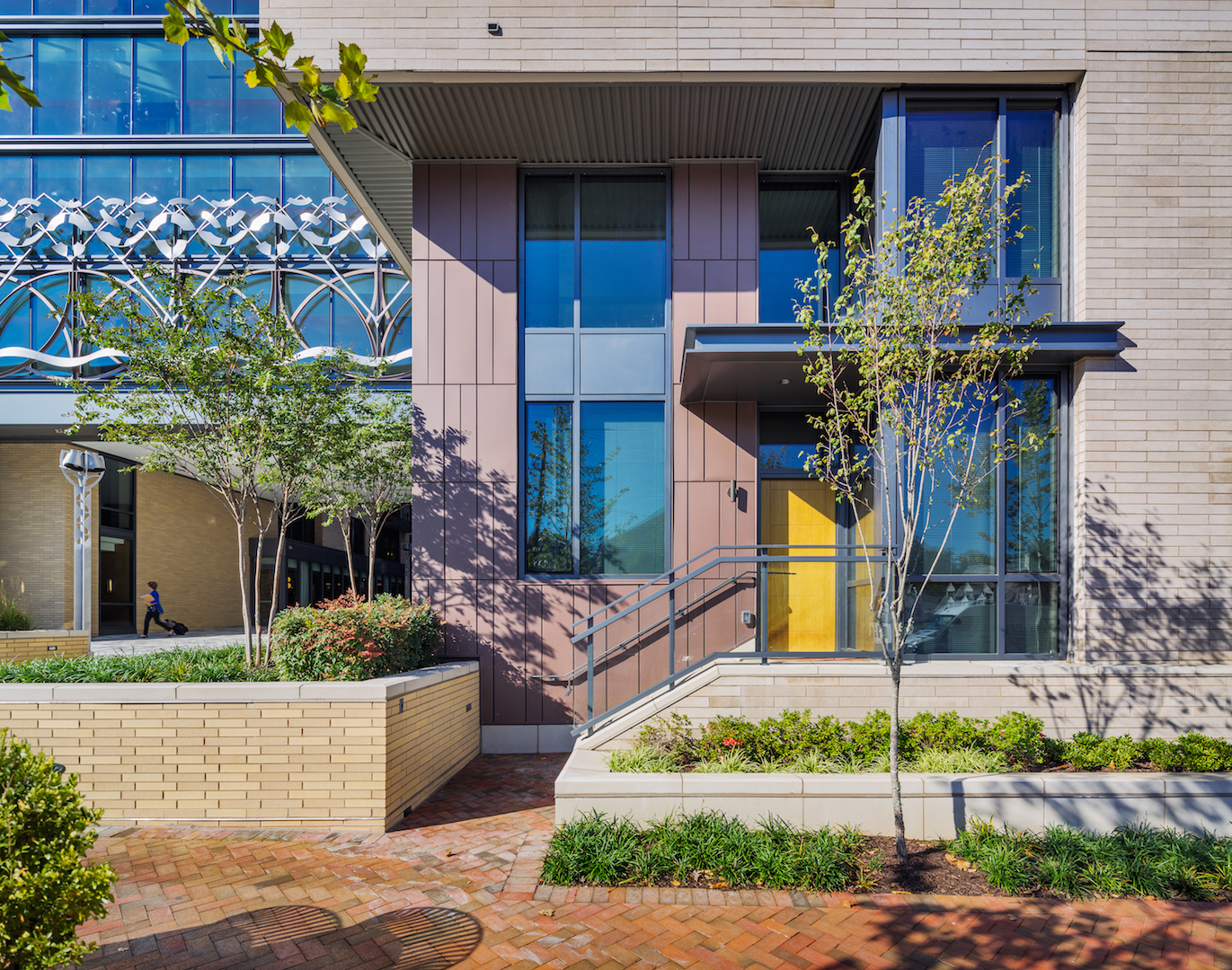 Responding to its urban context, the building’s richly textured, highly layered and humanly scaled exterior creates an animated and lively streetscape. A new pedestrian plaza at the corner of Woodmont and Battery Lane provides a gracious entry to the residential lobby. Above, the building exposes a broad section of the internal corridor through a dramatic window wall façade, connecting the residential life of the building above with plaza below. To the north, ground level duplex units animate Wisconsin through the inclusion of front porches, planters, and layered architectural surrounds.