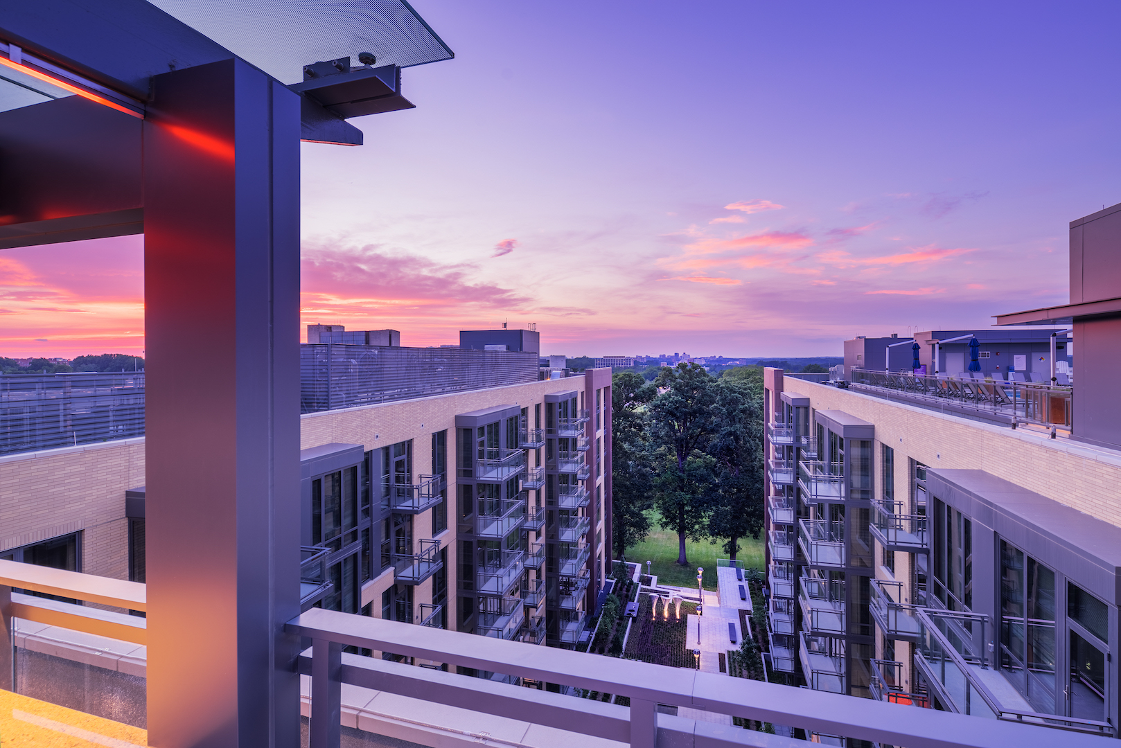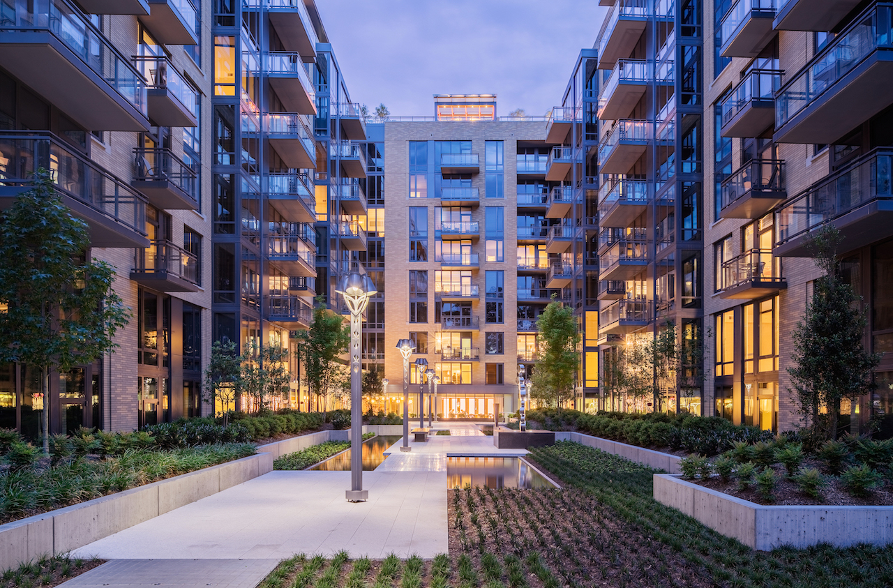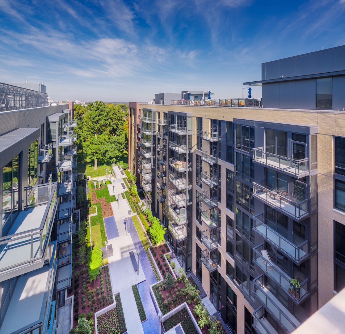 This large mixed-use residential development on a gateway site in the Woodmont district of Bethesda features 370 units above a 50,000-sf grocery store. The U-shaped building is a response to two busy avenues that border the site, Wisconsin and Woodmont. A spacious interior courtyard overlooks parkland to the North, providing a refuge for residents.