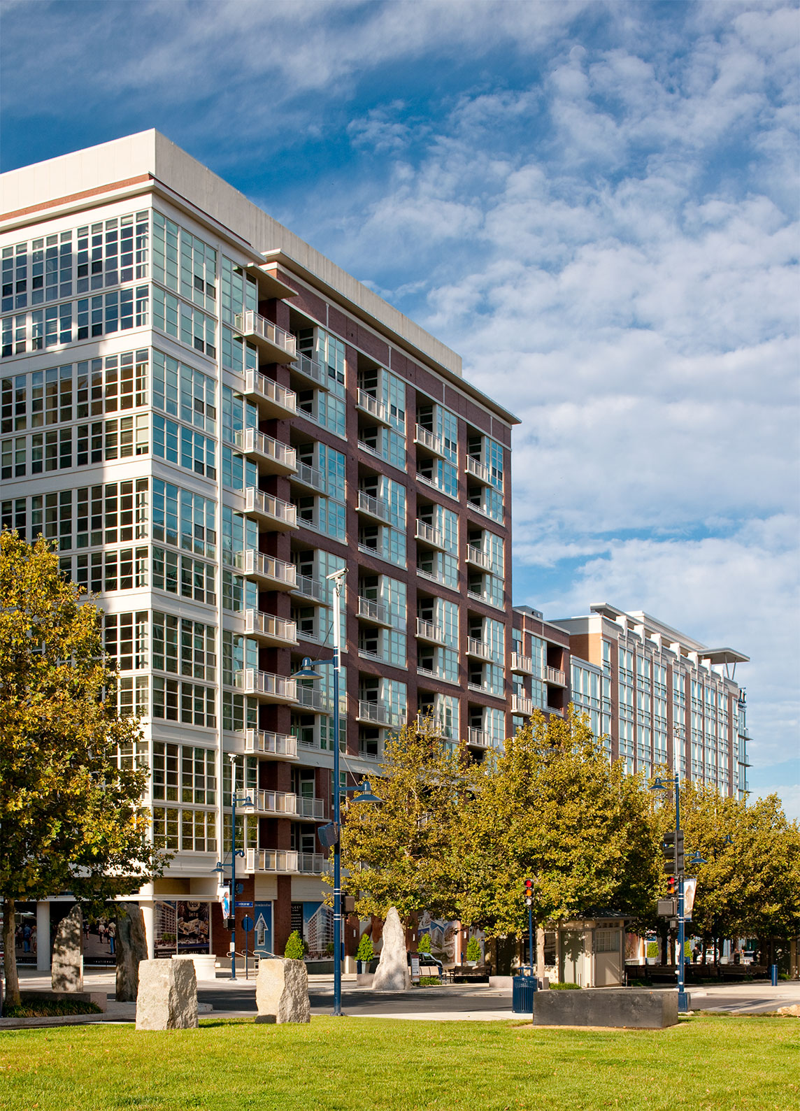 Fleet Street, a high-rise condominium of 163 homes, is a contemporary 11-story building highlighted by glass and clean lines. Amenities include a fully equipped community room, a rooftop swimming pool and pavilion area, a fitness center and underground parking. An upscale hotel is in the same building, so Fleet Street residents benefit from the use of the hotel’s pool and fitness center.