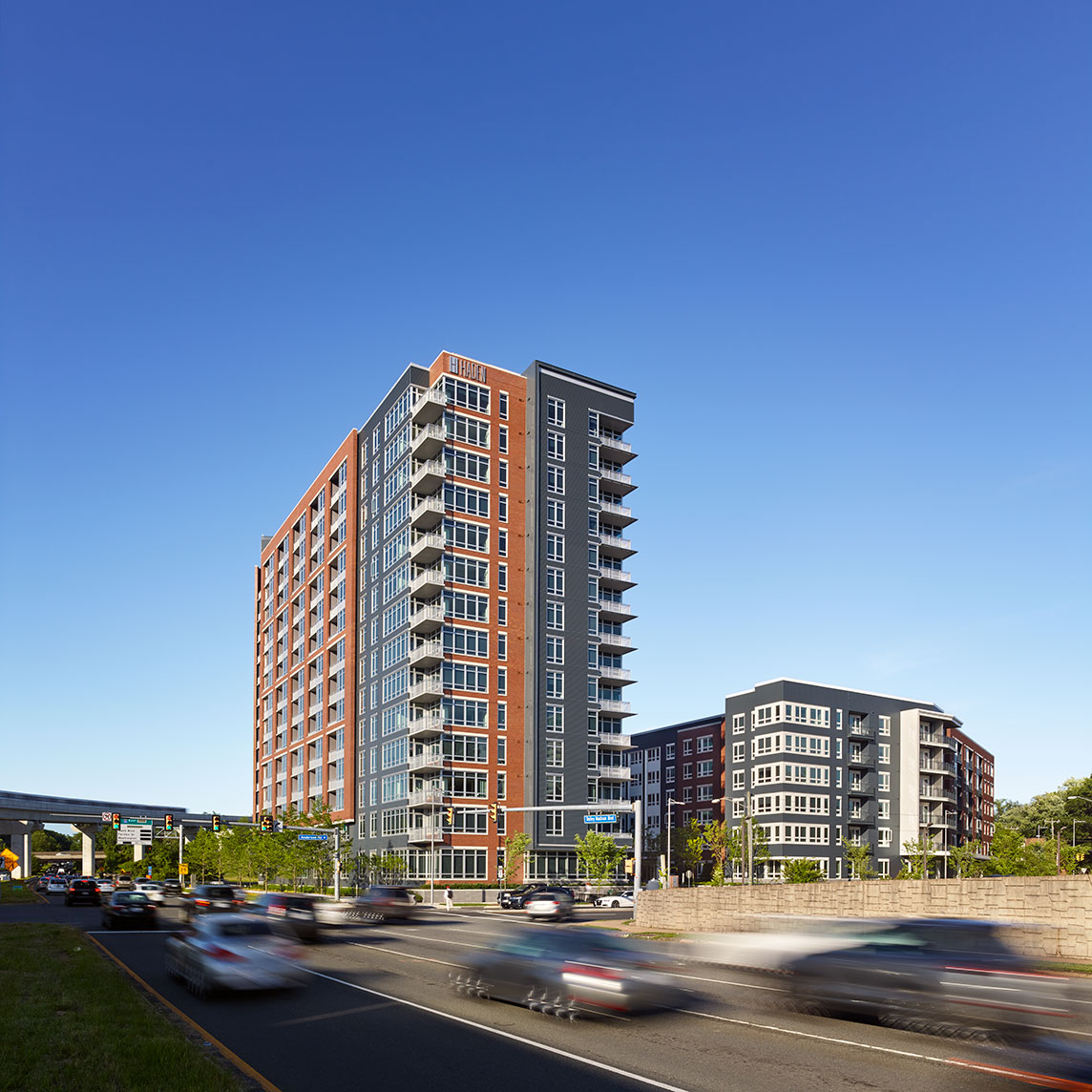 14- and 6-story multifamily buildings totaling 425 units and 428,871 SF. Two levels of below-grade parking accommodates 595 vehicles. Concrete Type I and wood frame Type IIIA construction.