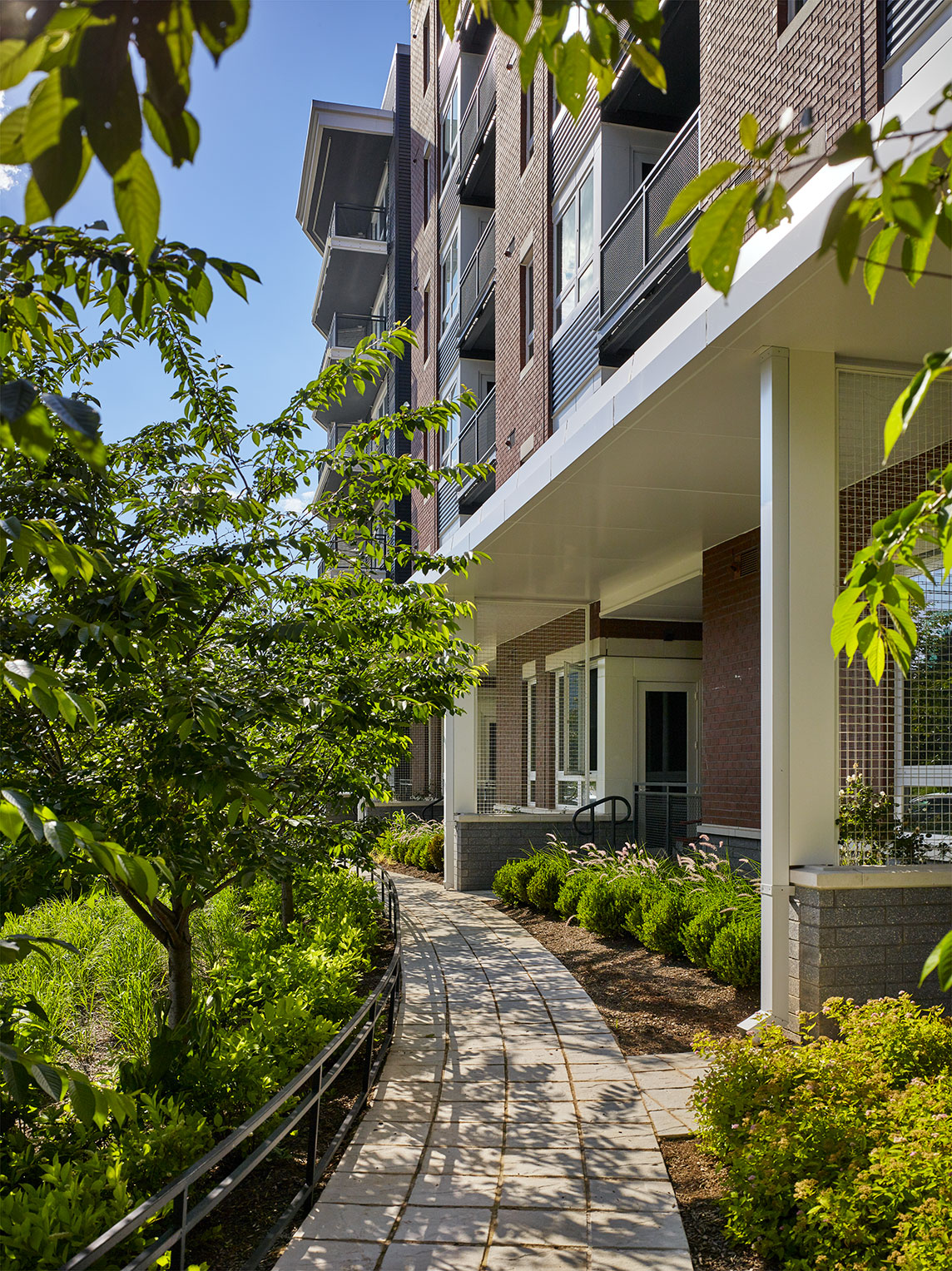 The project is designed to showcase a clean, crisp, contemporary building featuring light, shadow, texture and color. Haden Flats’ façade materials include a rich deep red/ purple brick and dark gray corrugated metal panel with white trim. Situated as a terminus to a new road off of Anderson Road, are a series of terraces utilizing movable, colorful sun shutters. The other balconies are designed into the massing to accentuate overall composition of the building’s form. A sixth floor terrace located at the southwest corner provides an exterior space offering neighboring park views and a place of solitude. In addition, residents will enjoy an expansive fitness center and 2-story club room with direct access to an internal courtyard. The courtyard is designed as a passive space with multiple intimate spaces for groups to relax and socialize.