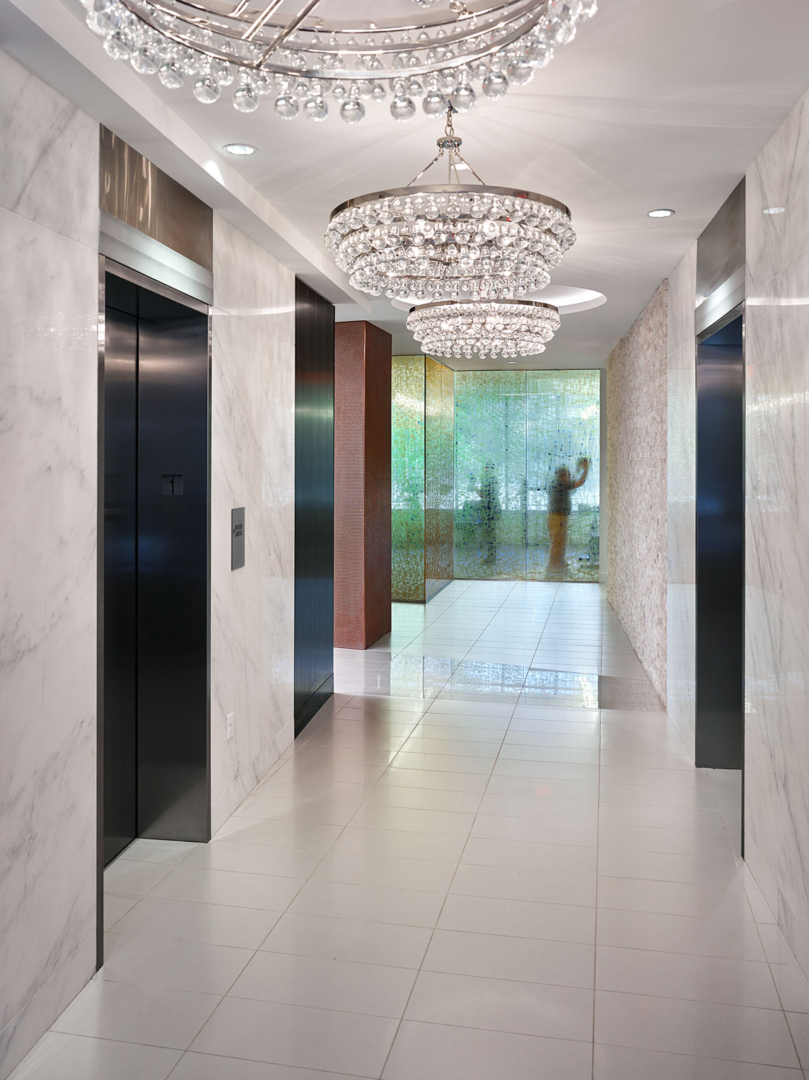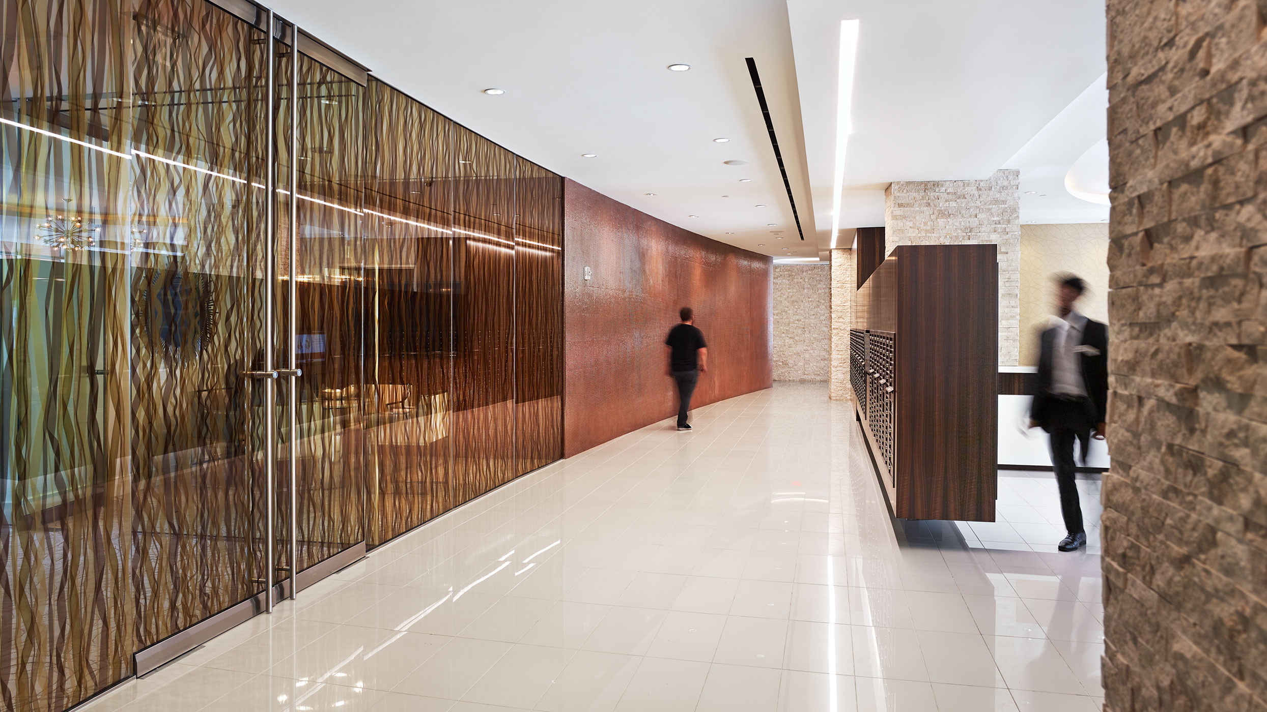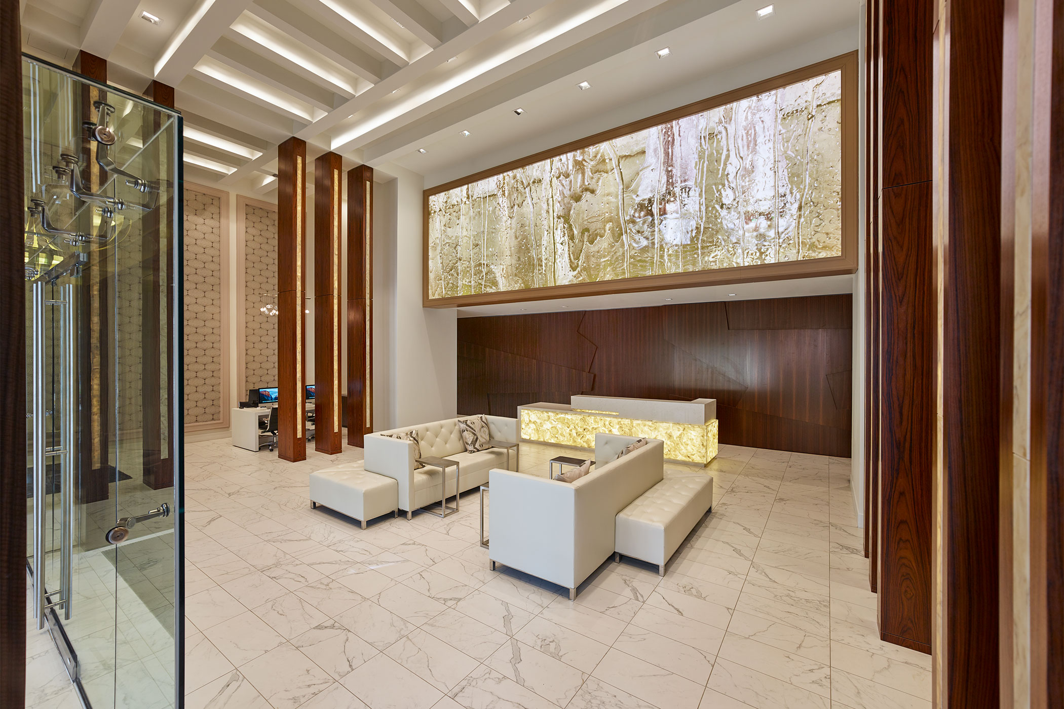 Upon entering the building, residents are greeted by the spectacular 2-story main lobby reflective of an upscale hotel. Above the reception desk is a large orange and brown backlit glass panel. These warm shades bring a hint of color to the bright room making it the lobby’s focal point. Located to the right, are two large sitting areas with an L-shaped sofa and lounge tables, and in the center is a circular banquette sofa. There are six large floor-to-ceiling unique wood columns with backlit onyx panels incorporated on the face creating a specific, more intimate sense of place. The abundant amount of meeting spaces encourages gathering. To the left of the front desk is a business/conference center separated from the main lobby by floor to ceiling glass windows and doors. The leasing office and a 1,500-sf gym are both located on the first floor adjacent to the lobby.