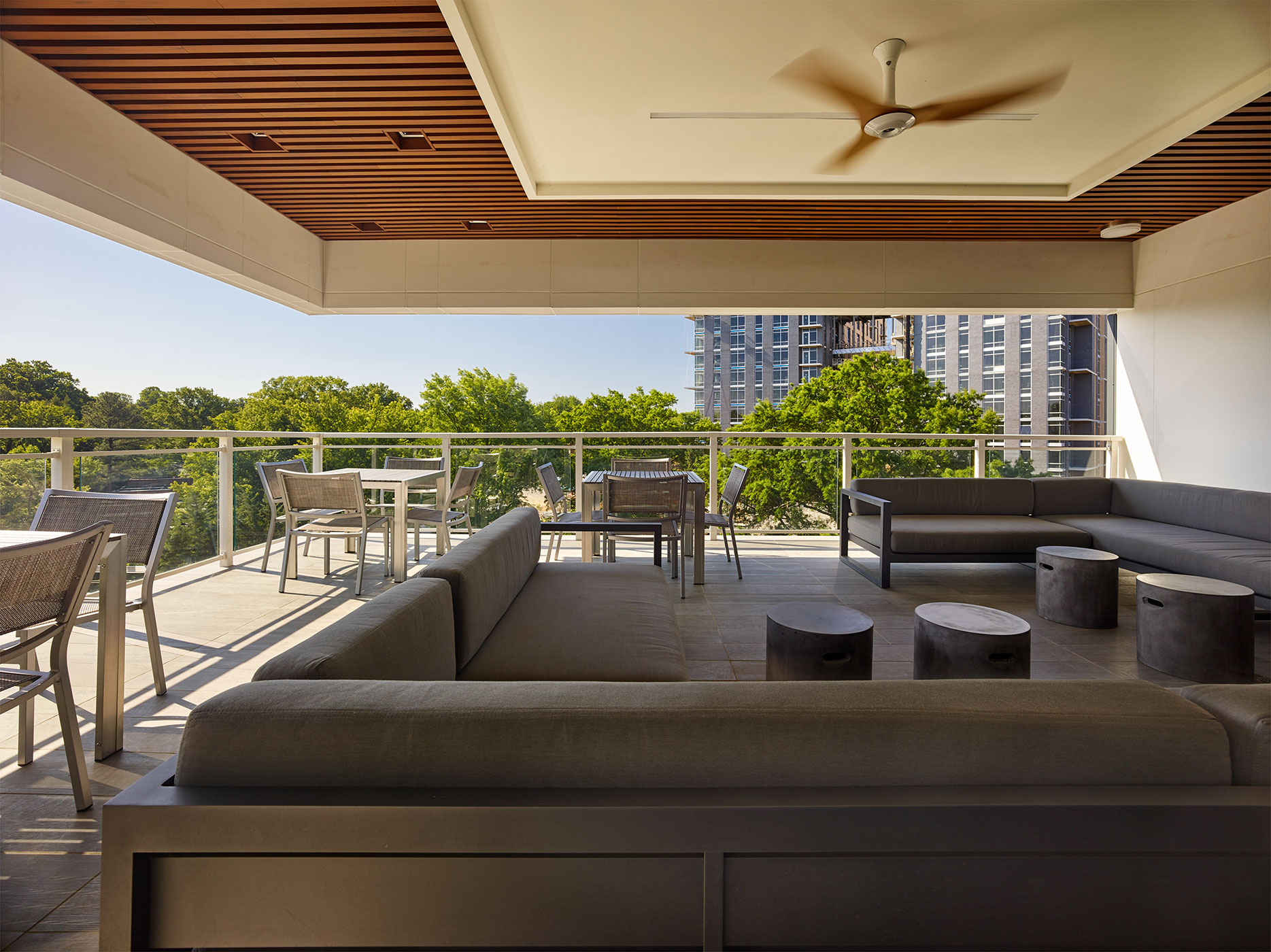 At 14-stories high, Haden Tower, the larger of the two buildings, is designed for the empty nester with hints of the 60s and 70s. The ± 246,000-sf building houses 222 units in a high-rise concrete-structured building located on the northeast portion of the site. The goal for Haden Tower was to create a lobby that represents the entrance of a single-family home. The design team was able to achieve this by creating a simple, clean space with warm colors and textures that are welcoming to residents. Additional amenities include a resort-style pool and a roof-top fire pit with cozy seating areas with impressive views of Washington, DC, Maryland and Northern Virginia.