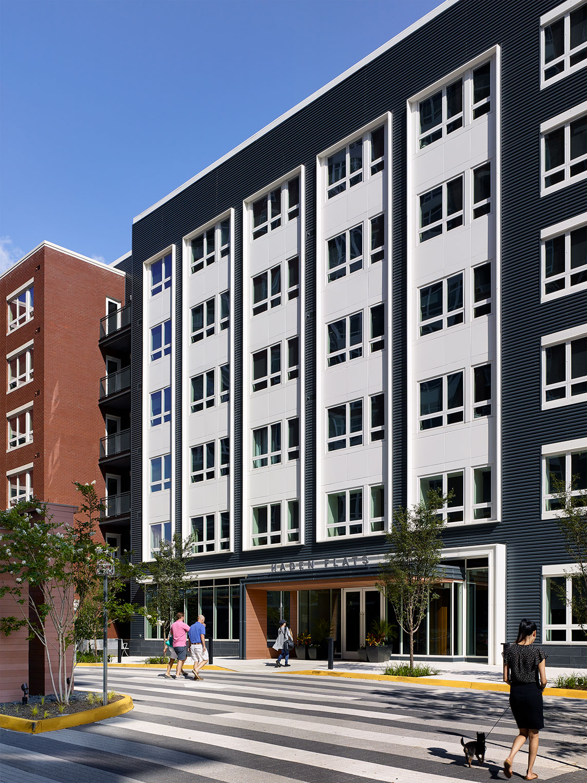 Haden Flats is a ± 221,000-sf, 6-story, 203-unit wood-frame over a concrete podium building. The podium level includes residential units and some additional parking. Haden Flats includes amenity spaces and pool, located on the podium roof structure. Haden Flats reflects the same high-quality construction as its neighboring high-rise. Unusual to wood framed construction, the facade utilizes a combination of materials to reinforce the massing and quality of the building, including expansive glazing. Entrances to both buildings face one another creating a challenge for the design team when it came to making each its own unique residence. Sticking to a contemporary hotel design for Haden Flats differentiated it from the vintage era of Haden Tower.
