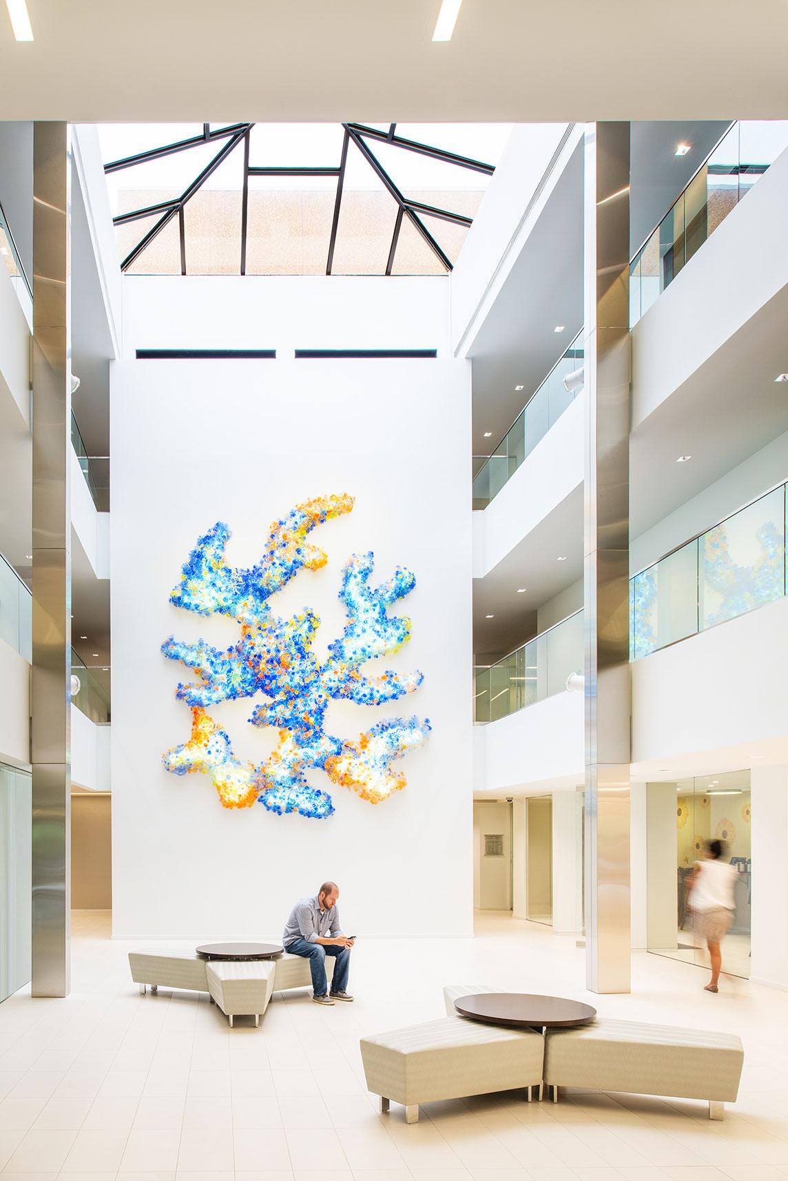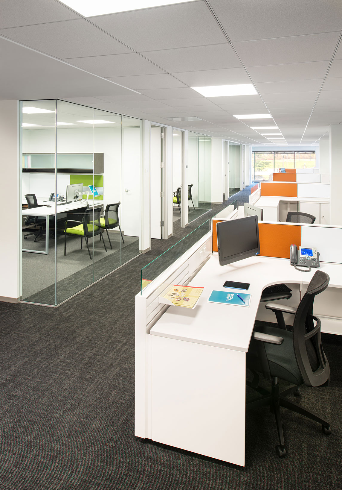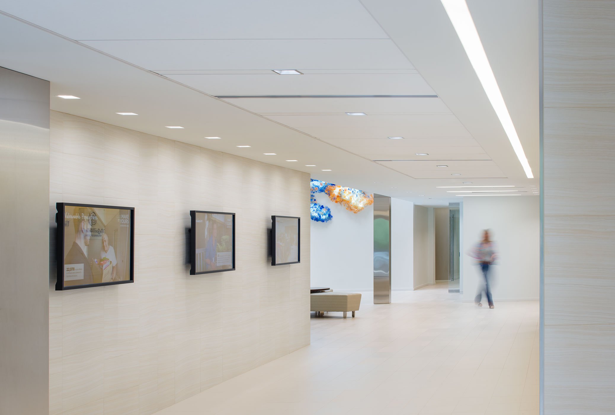 WDG worked closely with JFGW to reevaluate the way it conducts business by promoting efficiency in workplace design. Open work spaces were created to offer outside views from all areas, including private offices, which were created with glass-front walls. Designated collaboration and conference rooms, located along the building’s exterior window wall, showcase colorful embellishments that add contrast and break the continuity of white space. The overall aesthetic is a contemporary, luminous environment reflective of JFGW’s vision, brand identity and continued growth.