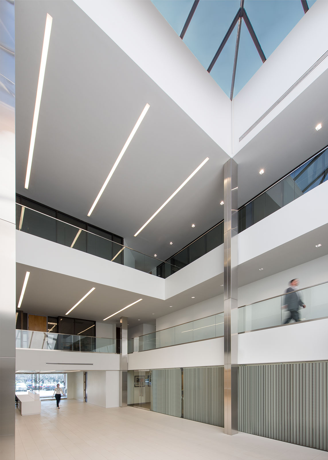 The building’s 3-story atrium lobby was redesigned to match the scheme of the floors above. Before the renovation, the existing condition of the interiors featured a dark, exposed elevator structure and outdated planters that cluttered blank spaces. WDG removed all the planters and changed the materiality of the interiors to physically and aesthetically open up the space. The team created a 3-story vertical surface to cover the exposed elevator, serving as a canvas for JFGW to display commissioned artwork. The current layout now connects the lobby to the offices, allowing a natural circulation for patrons. As a result of the renovation, the atrium’s skylight feature became more noticeable, further enhancing the ambiance of the lobby and creating an inviting space.