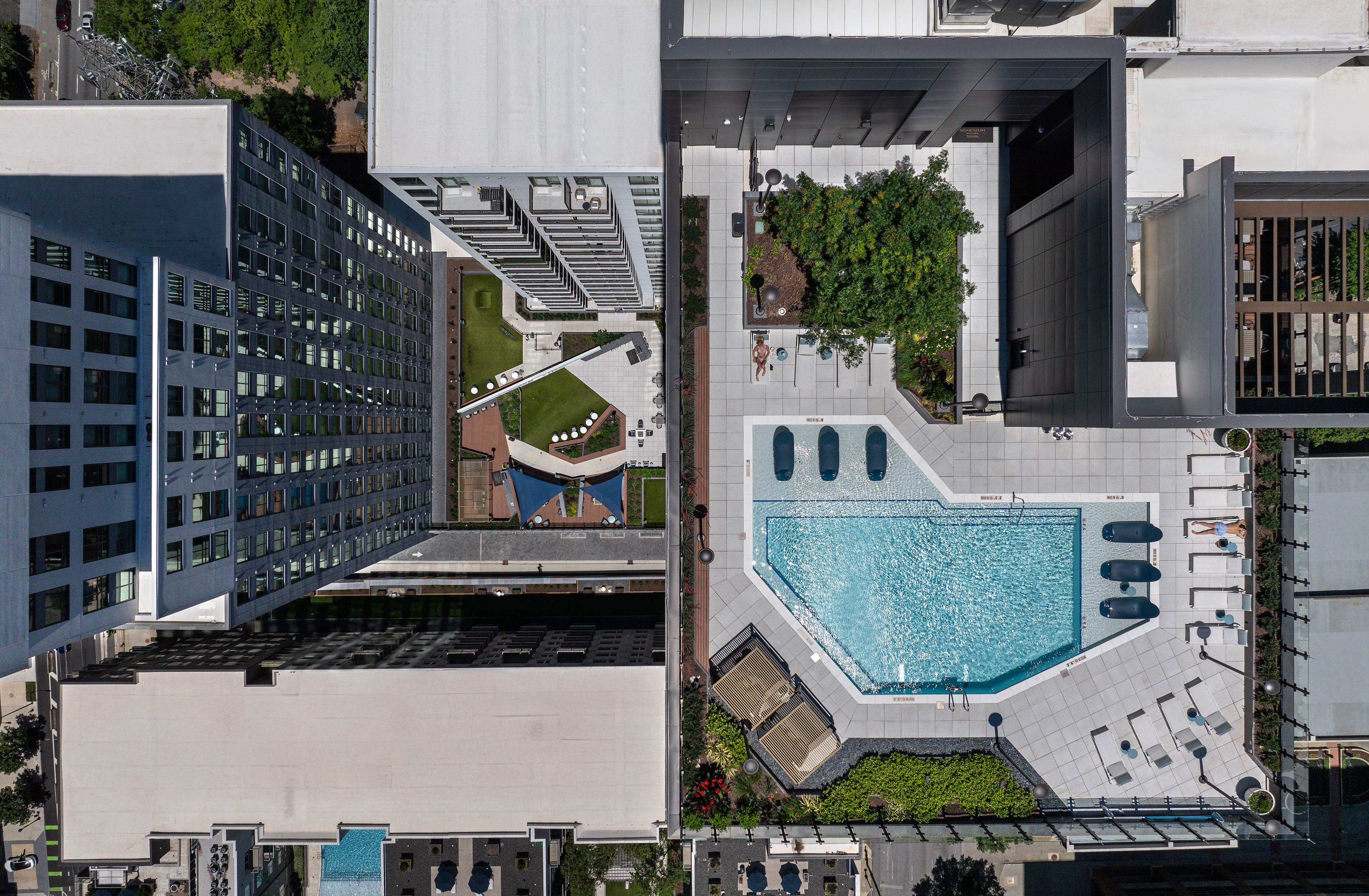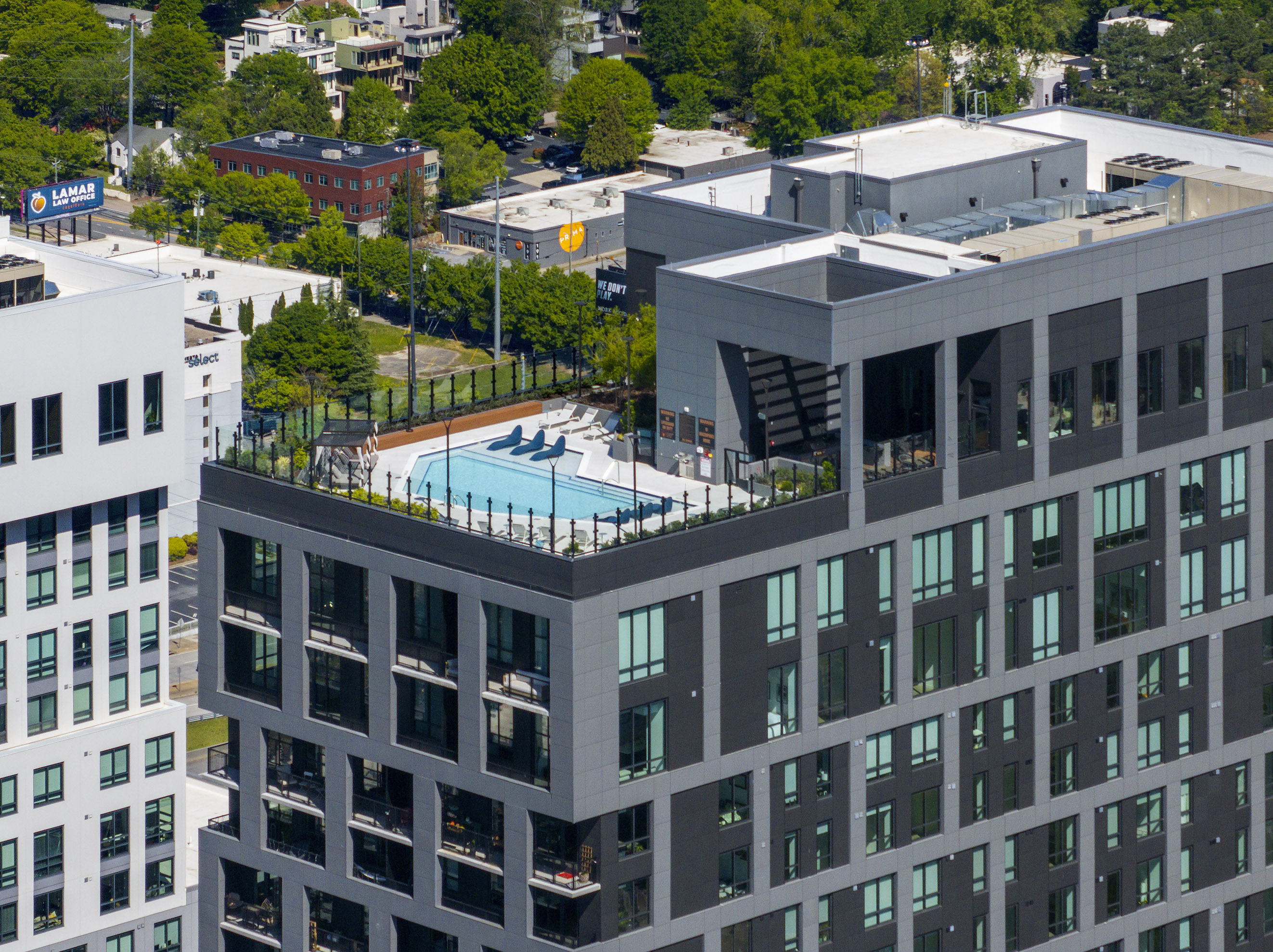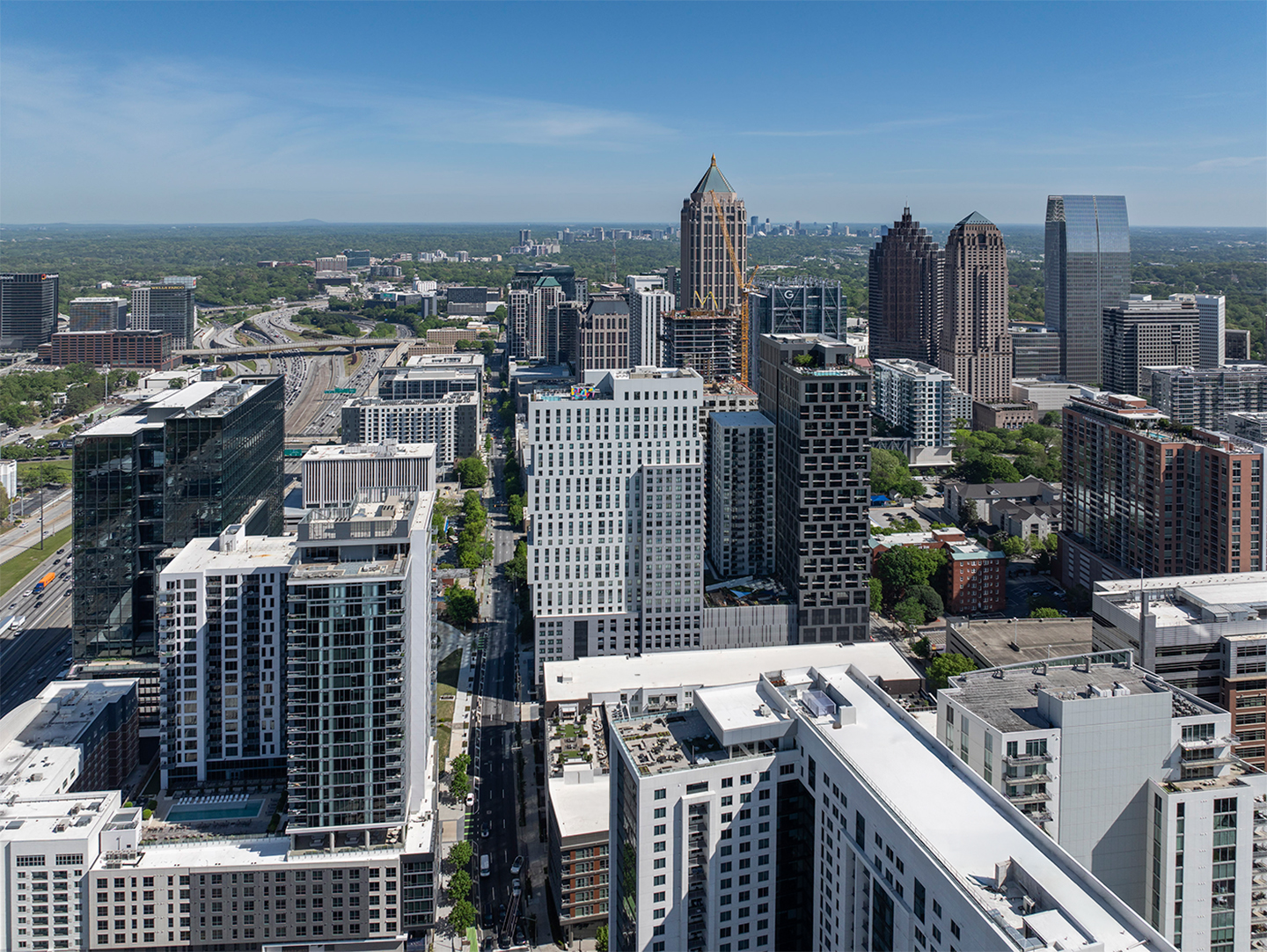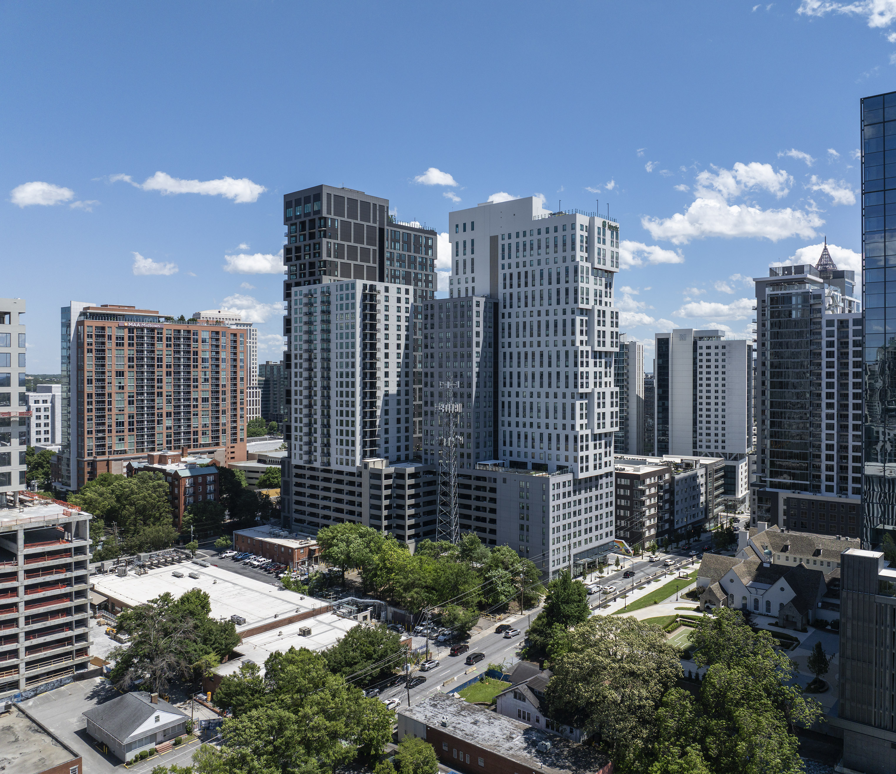 Positioned at the top of Atlanta’s Midtown District, the project sits within walking distance of Georgia Institute of Technology and Midtown’s vibrant restaurant and retail corridor. Rooftops offer sweeping views of the Downtown Atlanta skyline. Both towers rest atop a 9-story parking structure and retail podium, forming a new architectural icon at the intersection of I-85 and 10th Street NE.