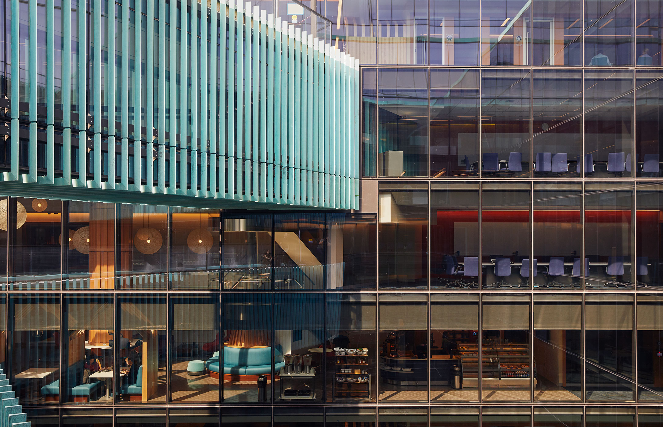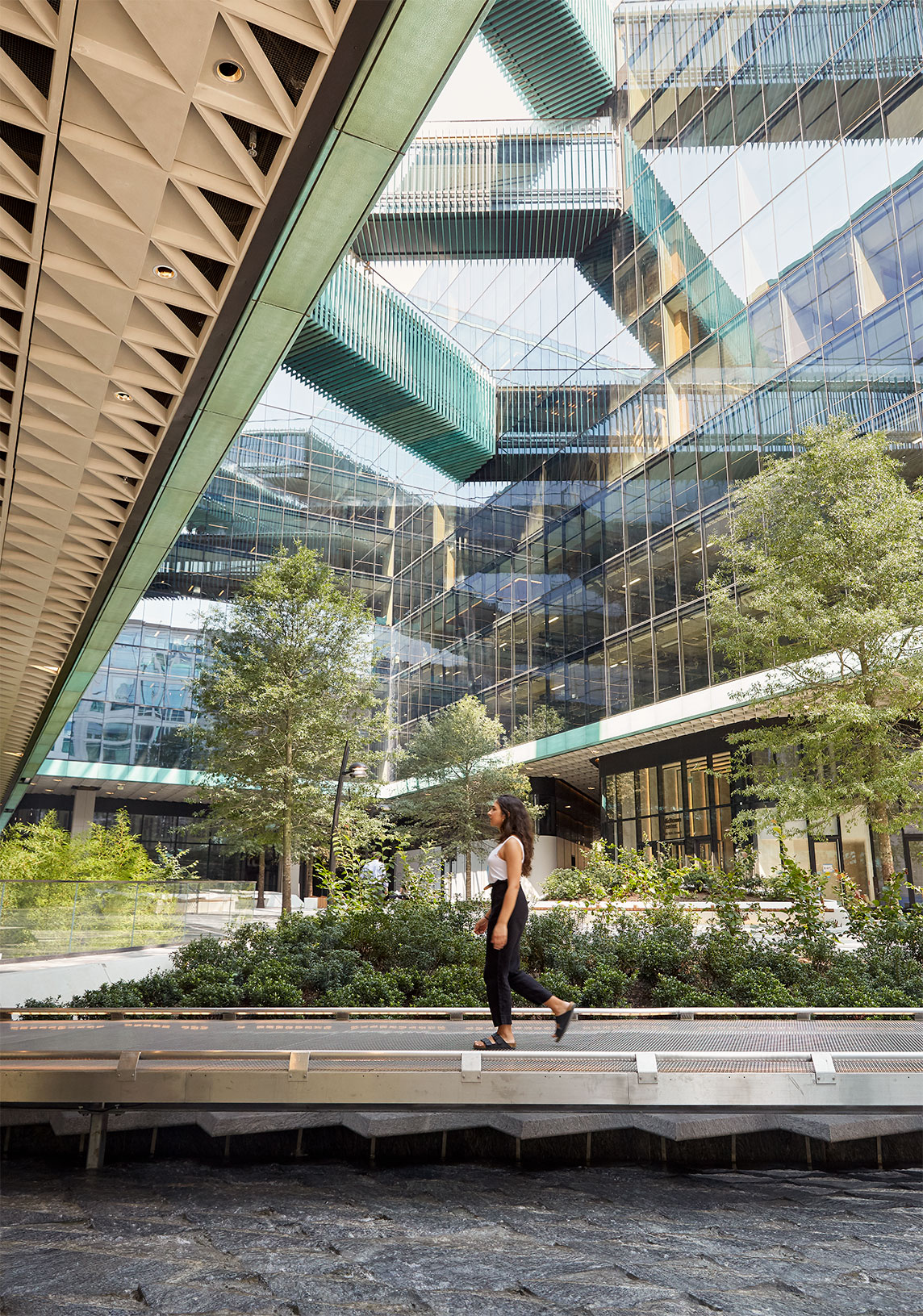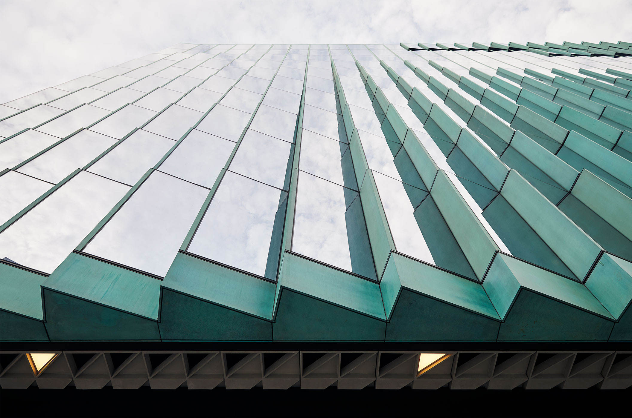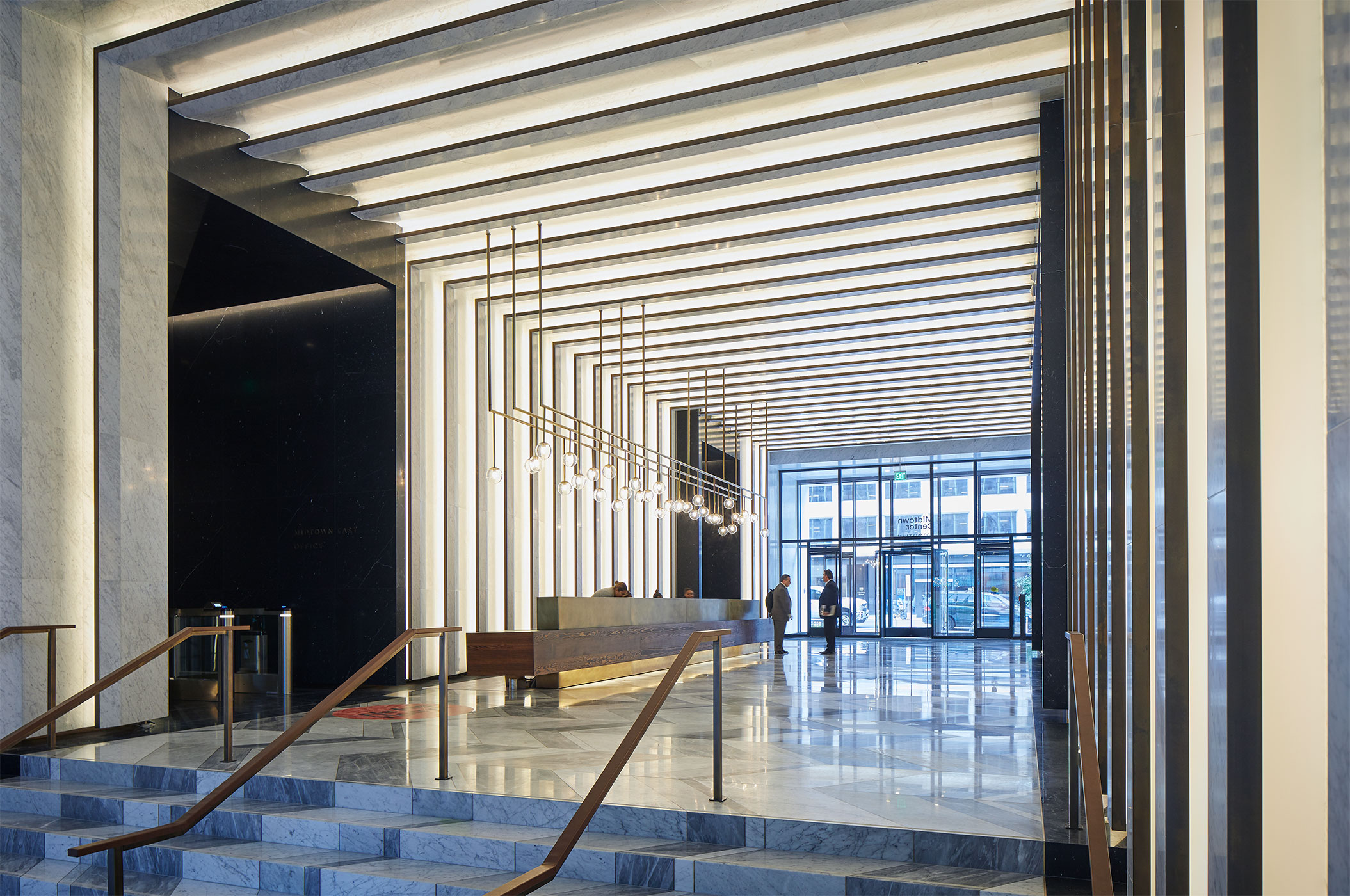 The building’s architectural expression optimizes glare mitigation and solar gain while maximizing daylight for its occupants. The façade consists of curtain wall panels of varying depths which are organized to create a distinct pattern, visible from different vantage points. On the urban scale, this technique creates a play on shadow and light as well as solid and glass while the material’s natural finish provides a richness of texture at the human scale. The envelope system both reinforces the building’s sense of permanence and reveals increasing levels of textural detail at various proximities.