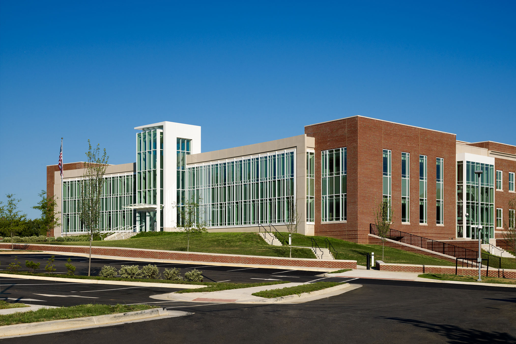 WDG designed the Department of Defense new Missile Defense Agency Headquarters in a design-build partnership. The design juxtaposes two architectural vocabularies to address unique functional and contextual considerations. The employee entry faces north toward the primary vehicular access. The modern architecture utilizes a sweeping two-story "randomized," curved curtain wall, interrupted by a glass and metal entrance tower.