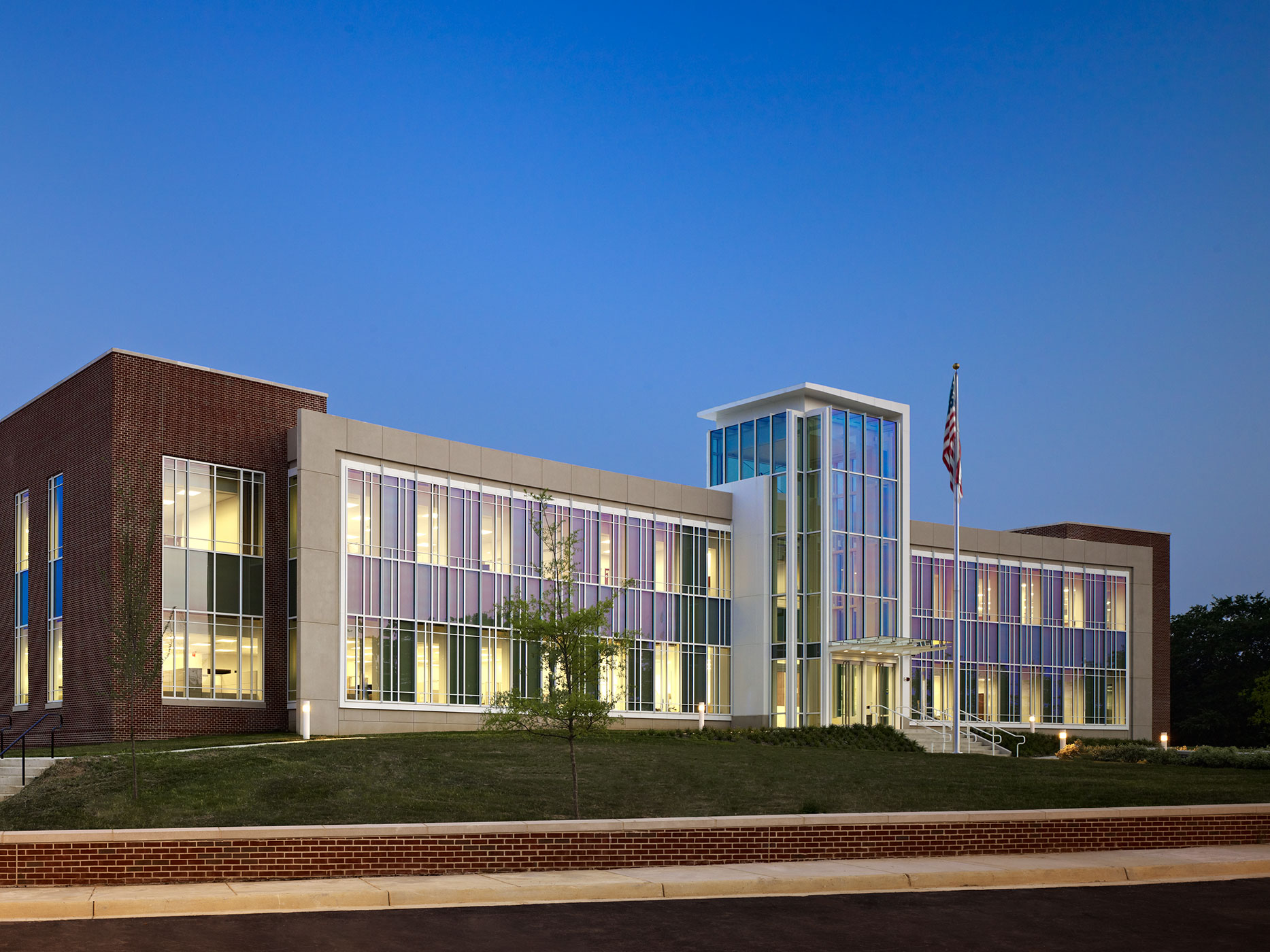 Accessed through a double height glazed entry foyer, the first floor provides access control spaces, security functions and administrative staff areas. This floor also includes private and open office spaces and their support areas, including conference rooms, business centers, and break areas. A ceremonial stair within the defining interior architectural element of the building, a dramatic, sky lit two-story atrium, provides access to the director’s and command suites on the second floor. A basement level houses mechanical space, building services, computer operation, and SCIF facilities.
