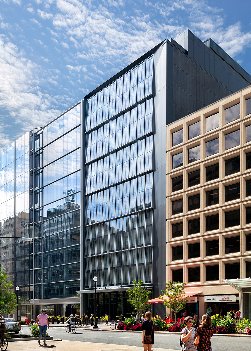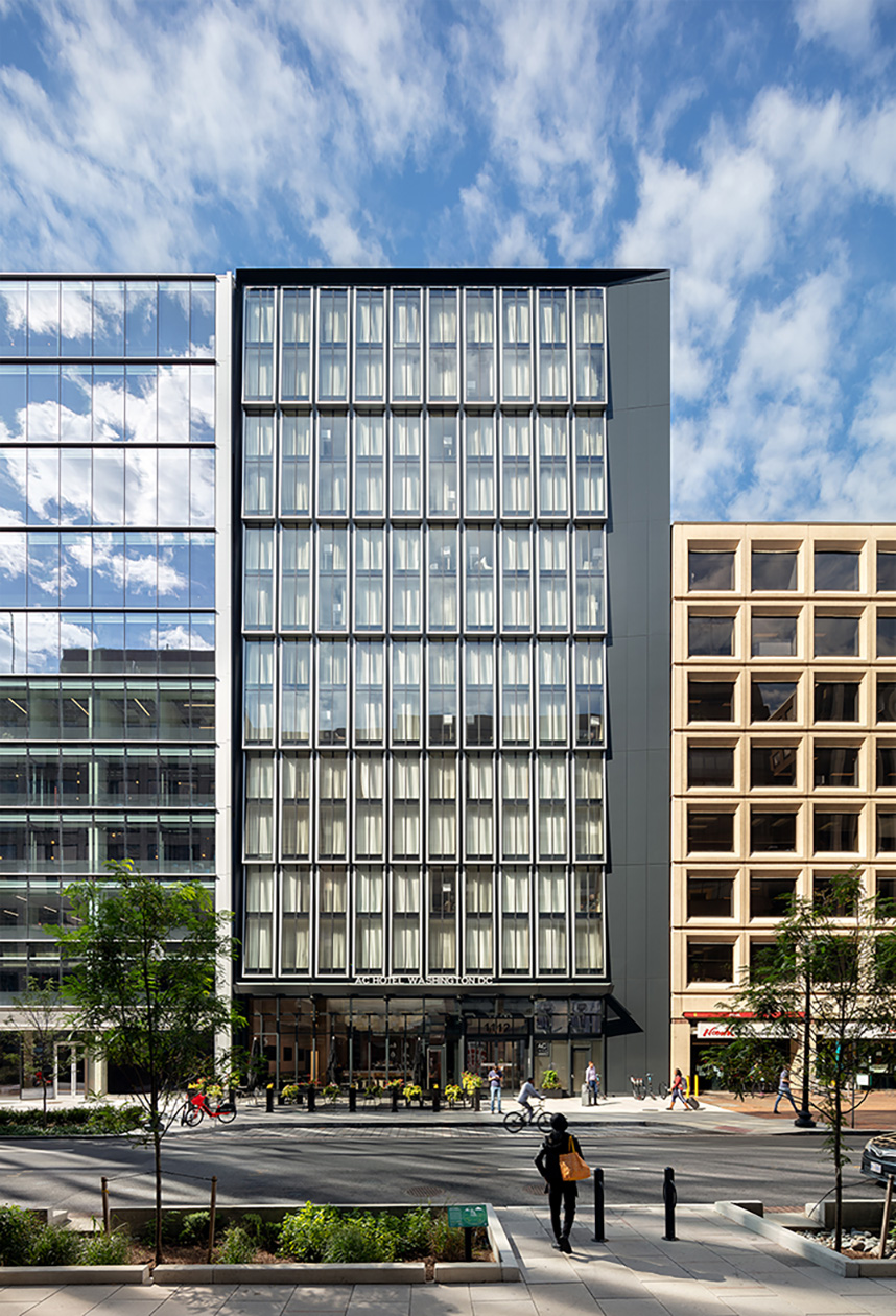 The proposed AC Hotel fills a narrow, rectangular-shaped site located at 1112 19th Street, NW between L St. NW and M St. NW, just south of Dupont Circle in Washington, DC. Sitting adjacent to two 8-story precast-clad office buildings, the new hotel’s main façade along 19th Street features a delicate, inclined two-story custom unitized curtain wall system whose panels’ unique arrangement contributes to create a subtle texture to the surrounding urban fabric.
