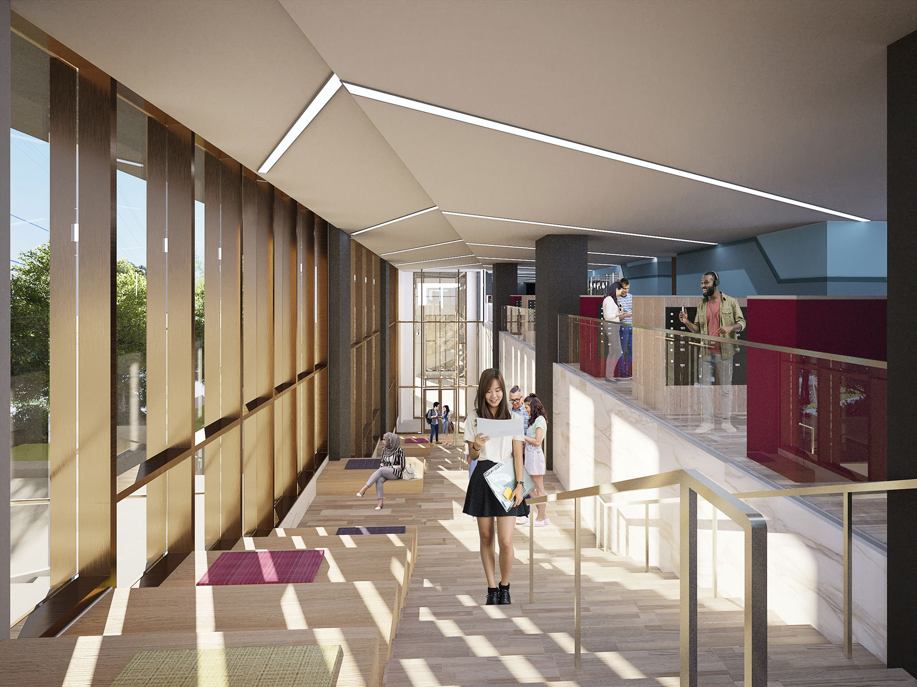 The total residential area is approximately 359,000-sf with 340 apartments comprised of 4-bedroom, 2-bedroom, 1-bedroom, and studio unit types. The Level 2 residential common area features lobby seating, a mail area, leasing office, business center, and a small open lounge opening to a 4,000-sf outdoor patio. The amenity area provides additional 8,500-sf space for include fitness center, twitch room, gaming lounge, catering kitchen, and pet grooming area. Other residential amenities include a 350-sf collaboration study lounge at each typical floor.