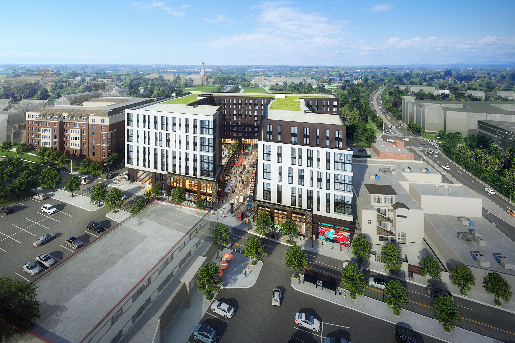 Union on Knox is located at the southeast corner of the University of Maryland (UMD), and will serve as a new pedestrian gateway for the University. At the west end of Lehigh Road, the existing parking lot will be replaced by a new monumental stair connected to the existing University pedestrian path, and a new plaza will be built adjacent to the Level 2 residential lobby entrance. Due to existing site grading, the main lobby level is approximately 20-ft above the ground floor retail space along Sterling Place, a one-way private street flanked by retail on both sides. Retail also extends to the east end of Lehigh Road and the project team intents to collaborate with the University to improve the existing park on the north side of the road to create outdoor amenities for both retail as well as the University.