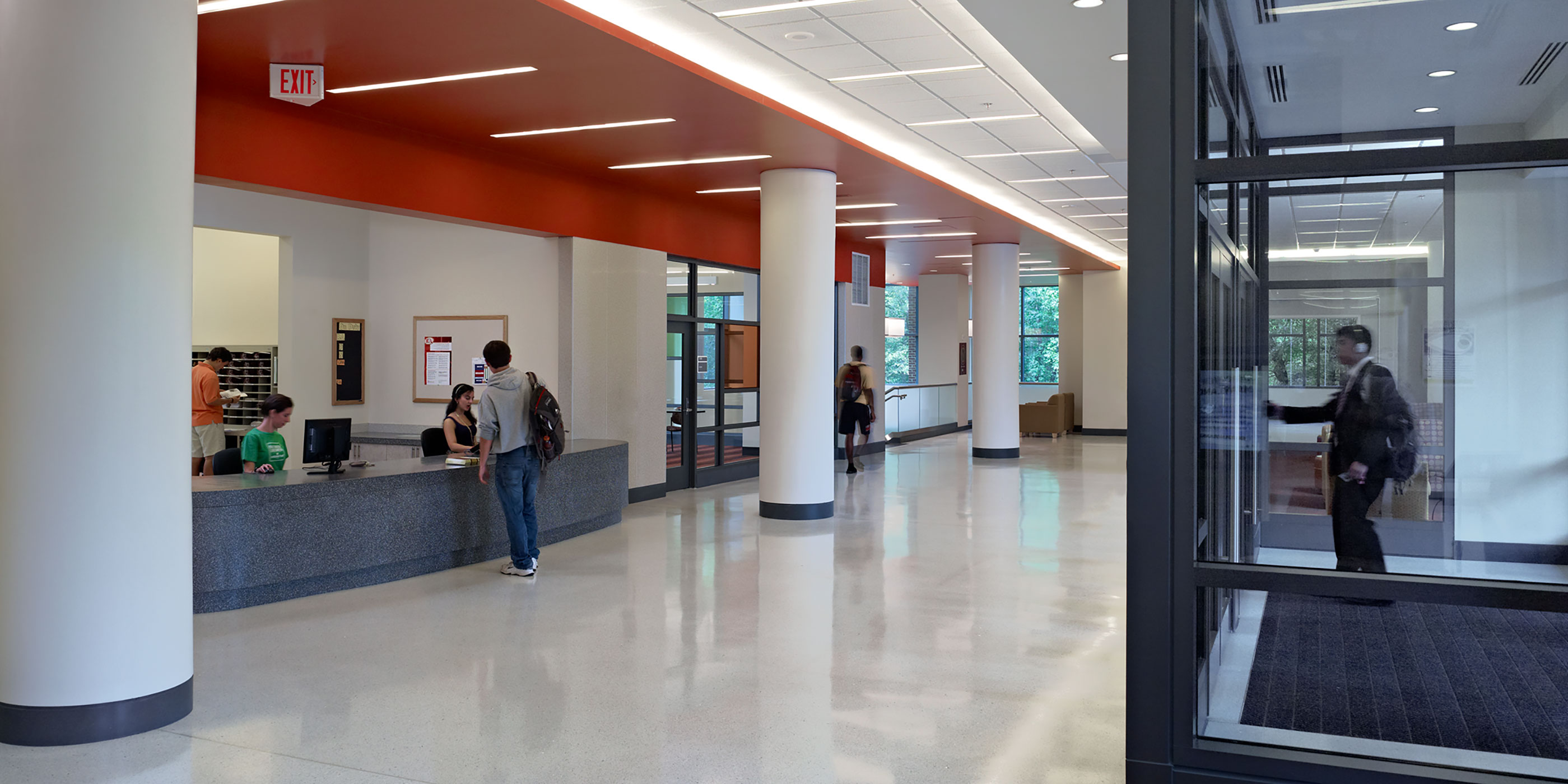 The design reflects a unique melding of the university’s historic Georgian architecture with modern systems and program elements. The tripartite organization of masonry, cornices, and stone treatments reduce the building’s verticality, with large metal storefront window systems to break up the horizontal expanses of brickwork. Inside, these modern glazing systems flood the common spaces and lounges with light and transparency.