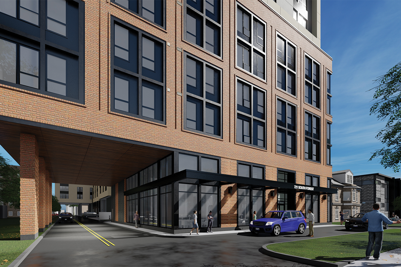 To complement the surrounding context the building is designed with a setback at level 6. This serves two purposes: first, the 6-story massing helps to reinforce the pedestrian scale along South Forest Avenue; and, second, it allows for uninterrupted sunlight to reach an existing grove of Legacy trees north of the site. This 6-story “head house” is designed to complement the character of the town of Ann Arbor by using brick with warm material tones. To add interest at the pedestrian level, the building façade employs contemporary rusticated/articulated brick detailing at the ground level brick piers. Within the masonry openings are a stacked bond of brick to accent the window opening surround and provide visual interest. Upper levels of the building utilize horizontal and vertical reveals and accent colors to provide variation and break down the scale of the facades. As part of the Sector Plan requirements, the project provides for increased development and a LEED 4.0 Silver Certification. It will be an all-electric building and design considerations will be made towards improving energy performance.